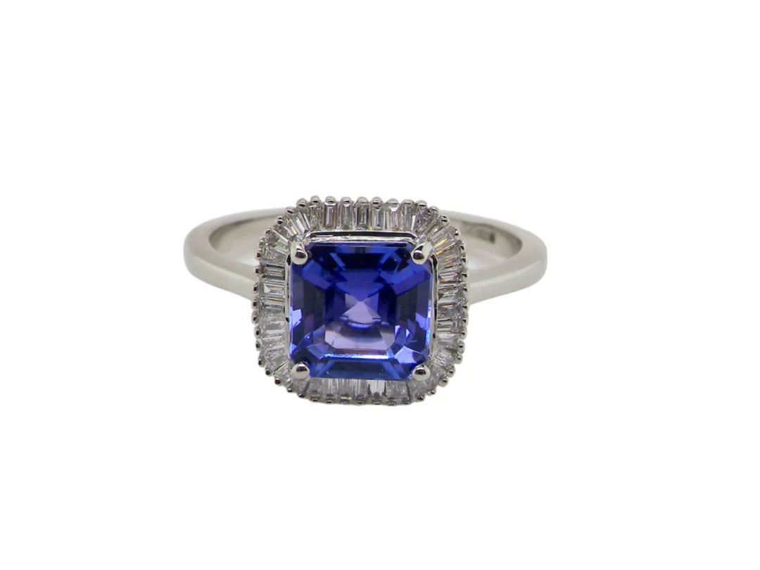 A fine statement of elegance, this exquisite platinum ring showcases a premium AAAA-grade tanzanite, square-cut to a striking 8 × 8 mm (approx. 2.2 carats). The gemstone displays the rich violet-blue saturation and brilliance synonymous with the very finest tanzanite