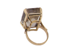 A dress ring containing a very large citrine stone, 20x15x12mm. Colour is yellow brown with a tinge of olive green. Encased in a double bar setting. Overall depth 14mm, weight 13.8grams.