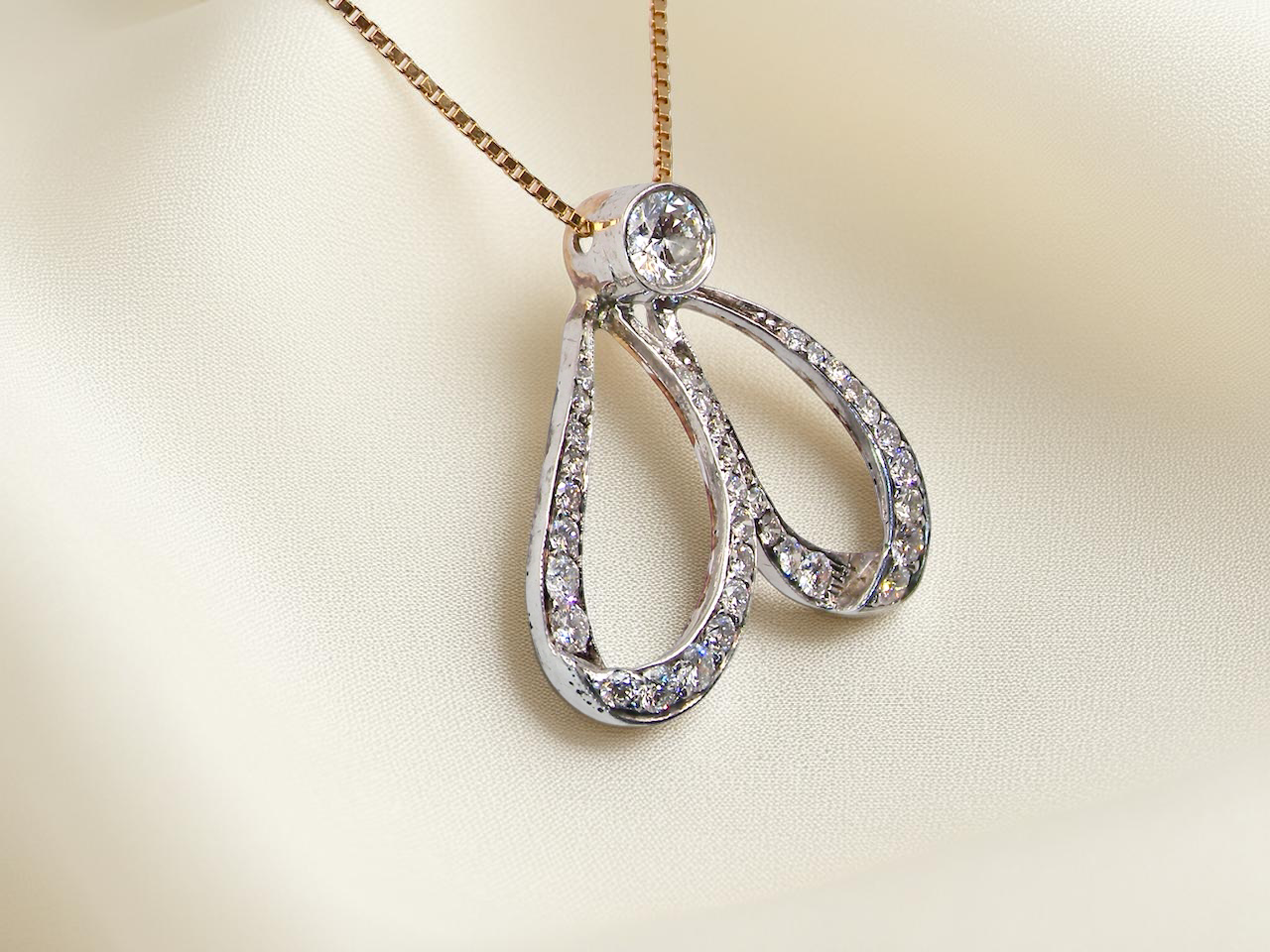 Each 'wing' is set with twenty brilliant cut white diamonds, from 1.3 to 2.3mm. Total diamond content estimated at 0.50 carats per wing. Each wing measures 20x12mm. Overall size 25x23mm. Total diamond content estimated at 1.50 carats