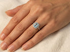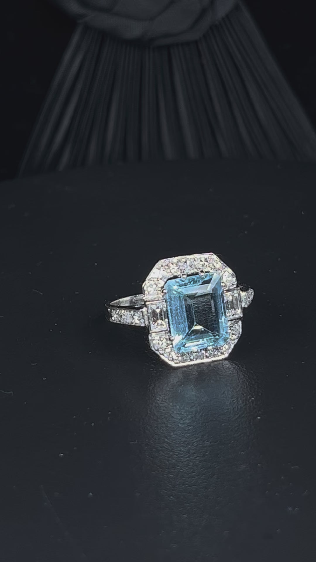 The ring centres on a striking ice-blue aquamarine (10 x 8mm), framed by baguette-cut diamonds to each side and seven old brilliant-cut diamonds above and below. The shoulders are set with four rose-cut diamonds on each side.