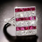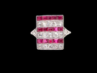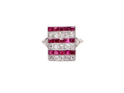 Six horizontal rows of gemstones. Three rows of calibre cut rubies 2.4x2.4mm, channel set and an estimated weight of 1.20 carats.