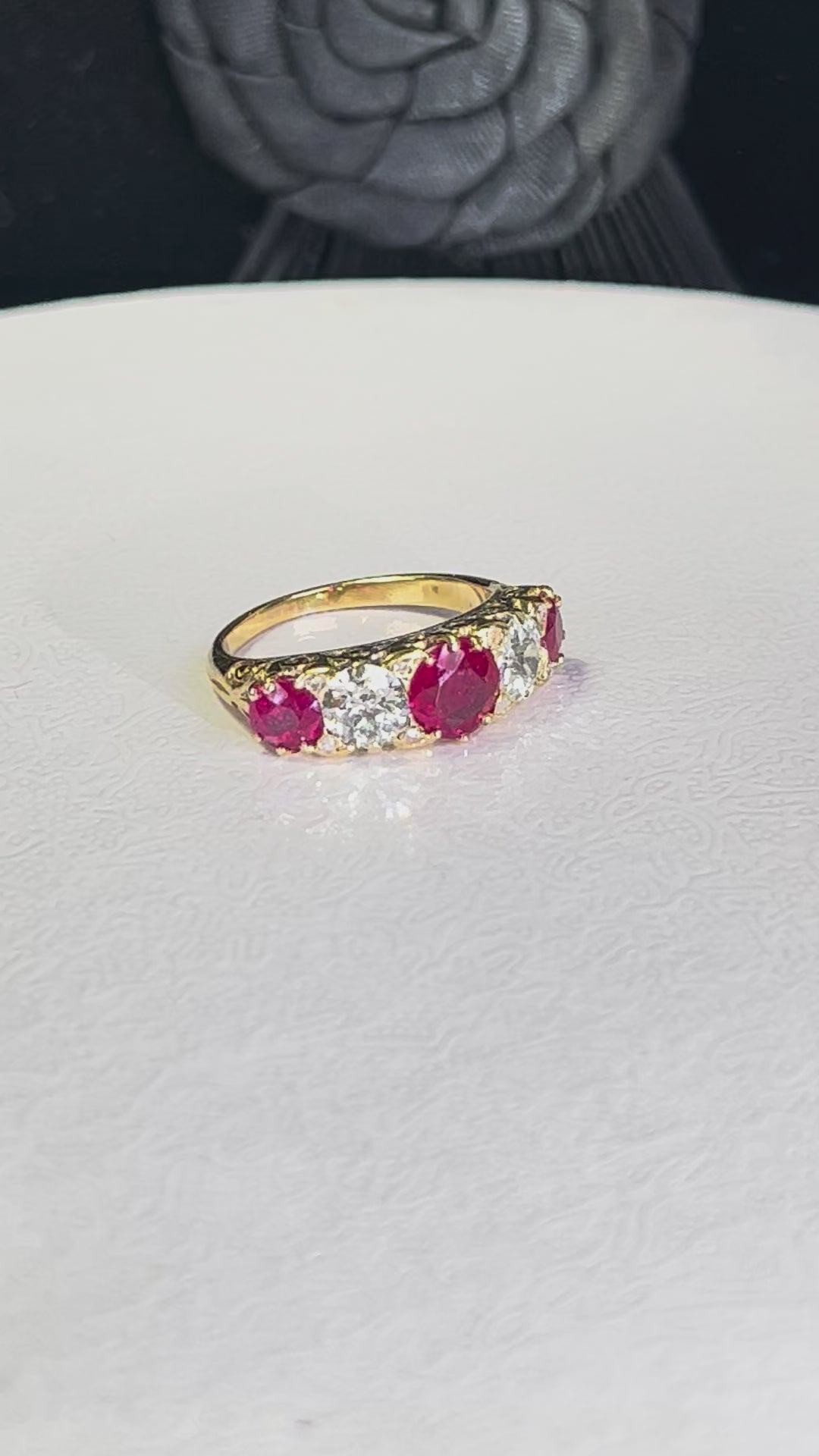 On either side of the central ruby sits an old brilliant-cut diamond, each measuring 5.6 mm (estimated 0.60 carats total), with colour graded H–J and clarity VS.