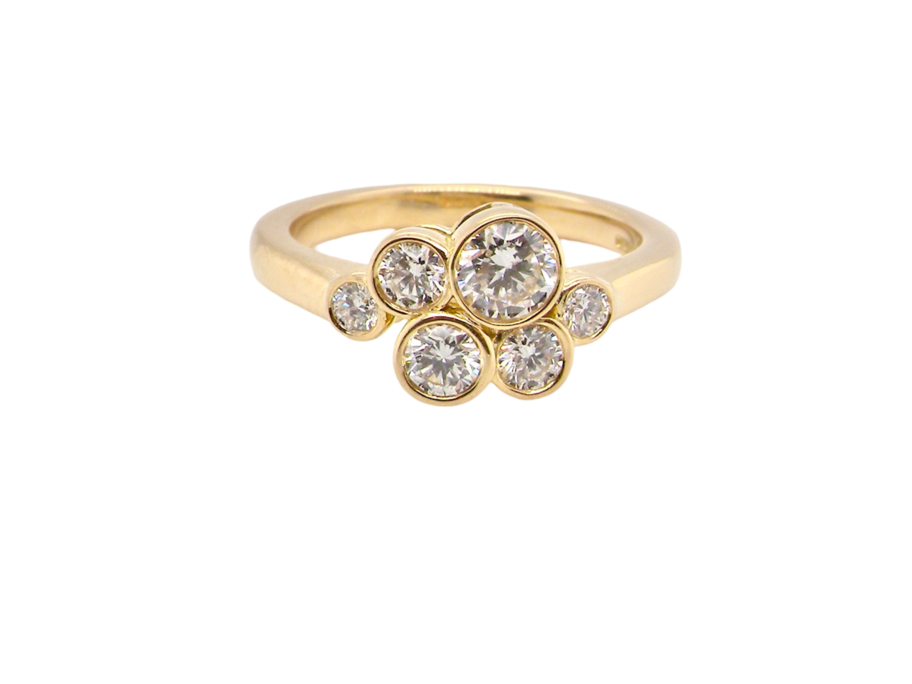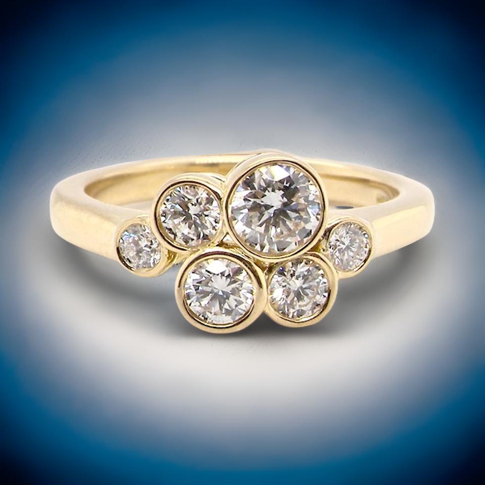 A beautiful diamond ring. Set with six various size round brilliant cut white diamonds. Varying from 2.3 to 4.8mm, total weight confirmed at 0.88 carats.