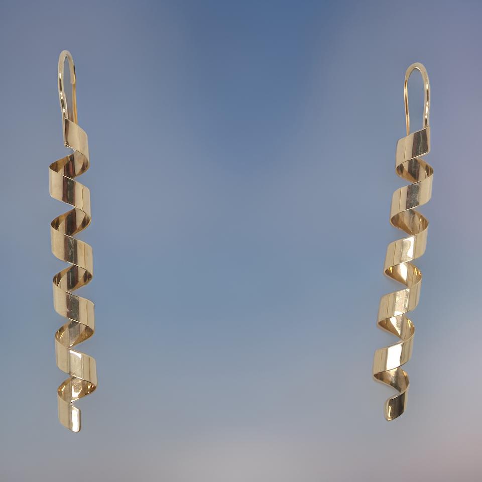 An unusual pair of drop earrings. In the form of swirly springs, each drop measures almost 50mm, width 7mm, weight each 1 gram. `