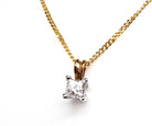 A single princess cut white diamond set in a four claw white gold setting, with a yellow gold bale to the chain.