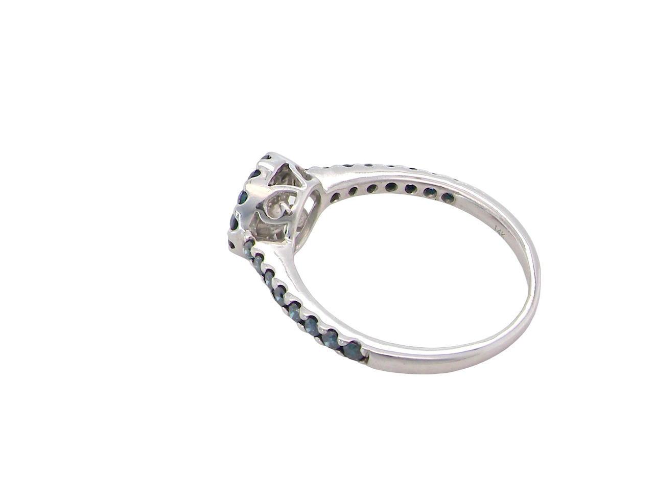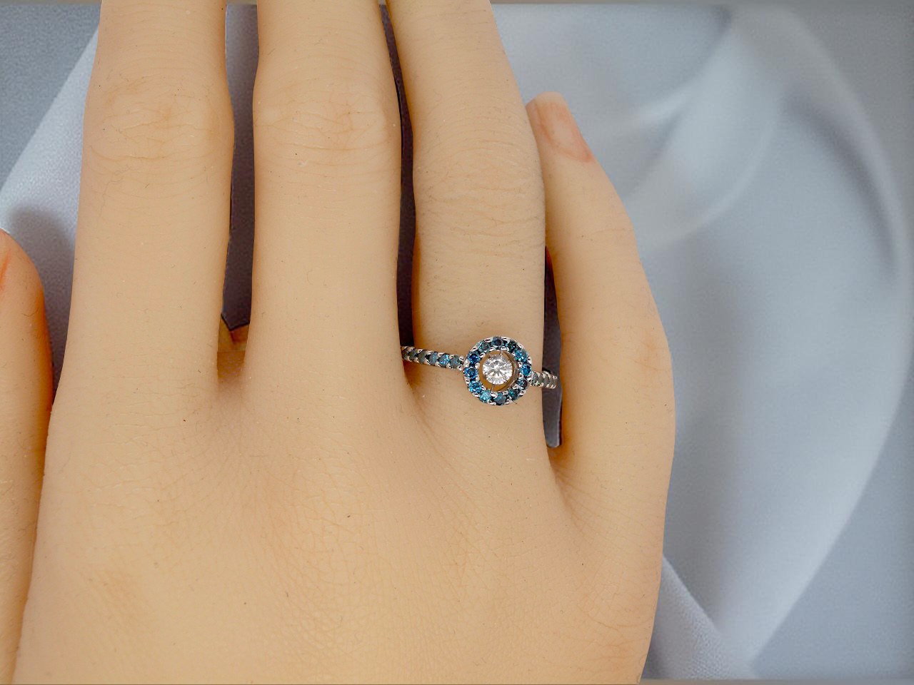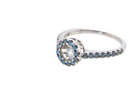 The diamond measures 4mm (0.25 carats) colour H-i, clarity Si. The outer border is set with twelve small blue diamonds, each 2mm diameter. Each shoulder set with eight 1.8mm blue diamonds. Head diameter 7.8mm. Weight 2.1grams