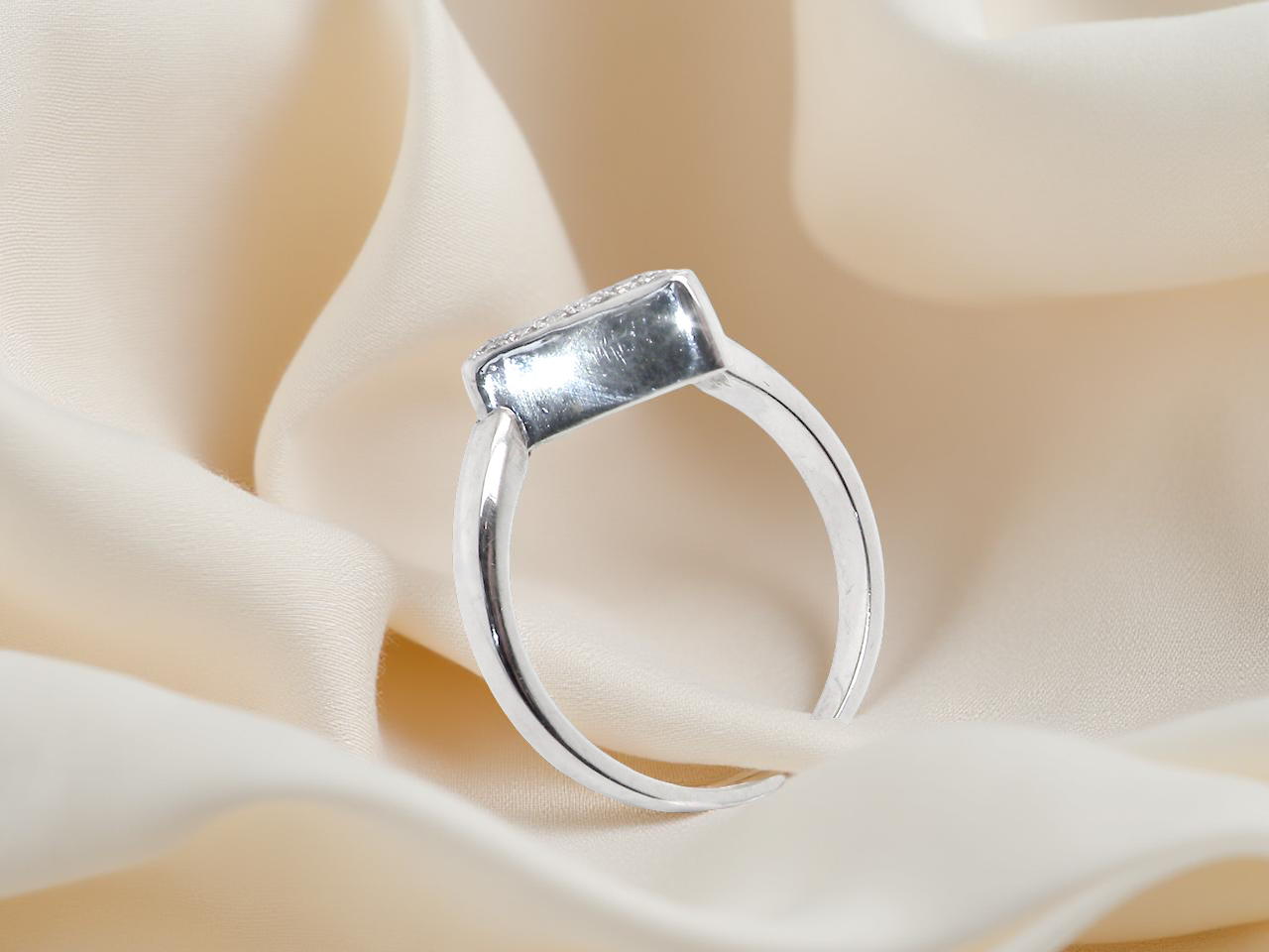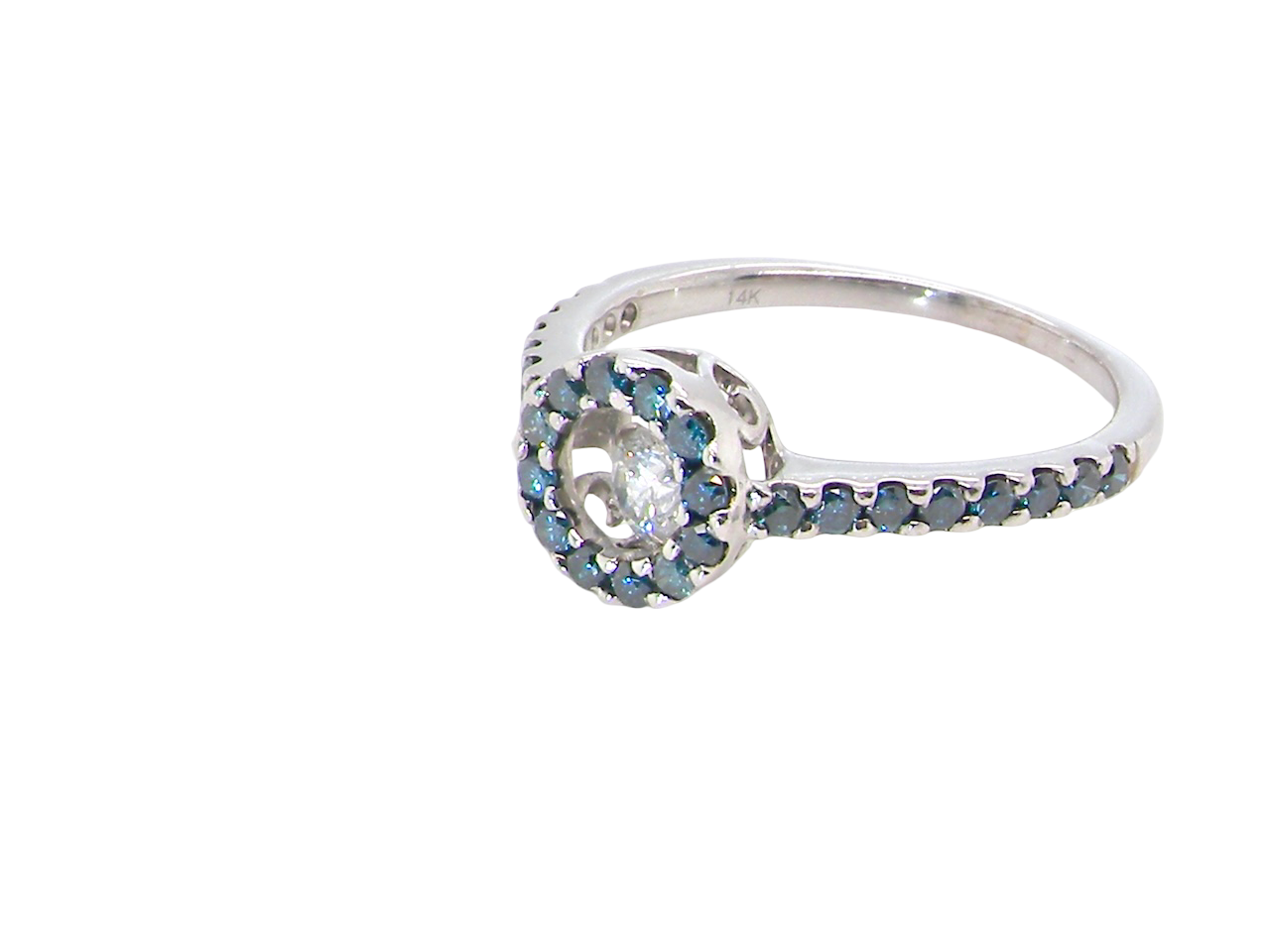 A 14 carat white gold* cluster target ring. The diamond is set between two loops which gives it an illusion of being invisibly suspended which makes it dance.