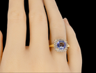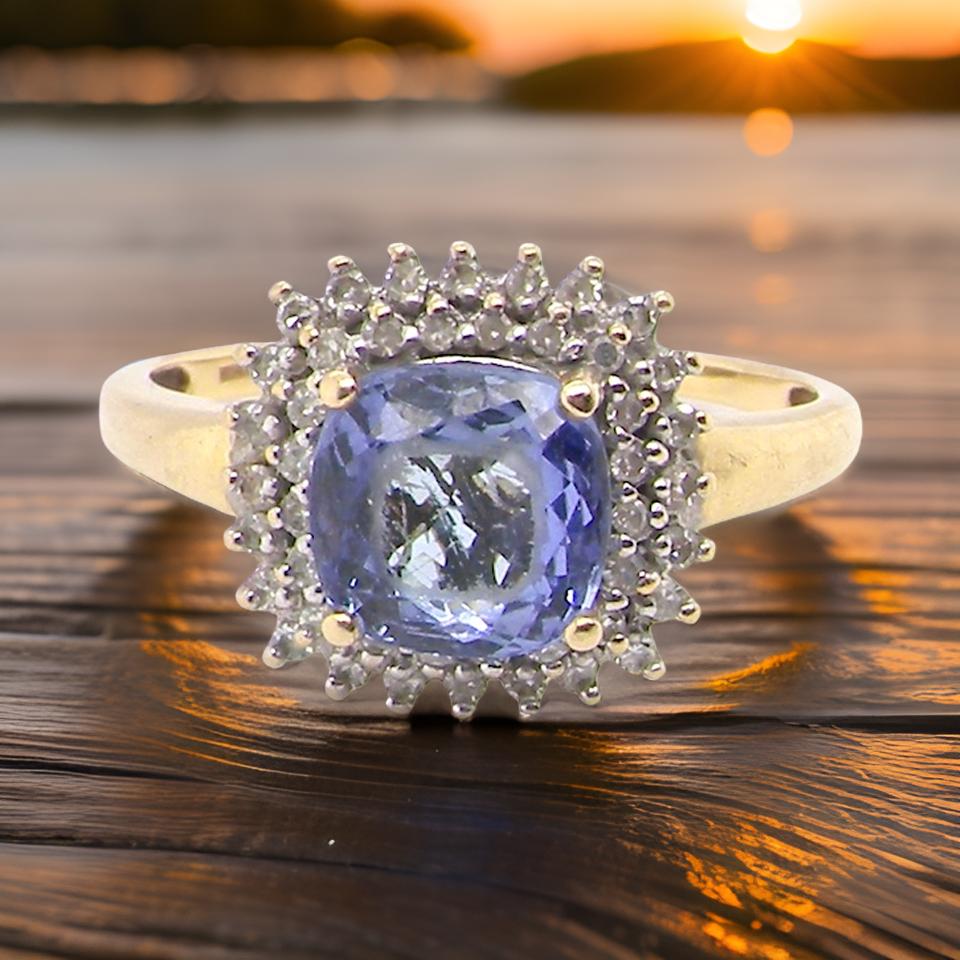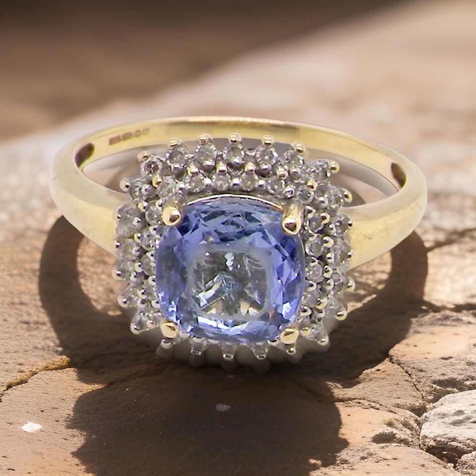 A cluster ring set with a cushion shaped tanzanite centre stone 7.5x7.5mm, retained by four corner claws.