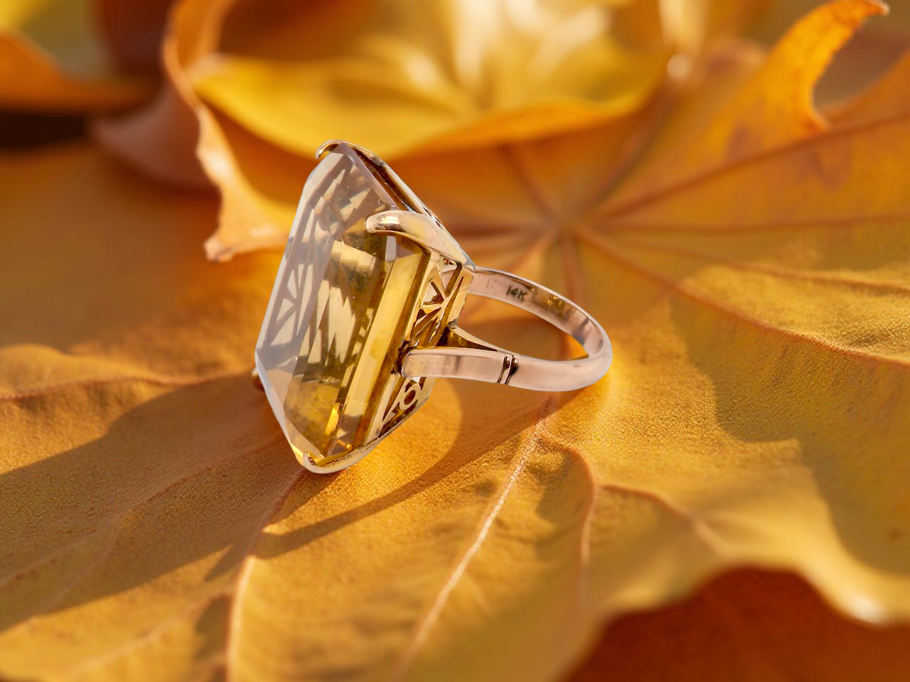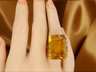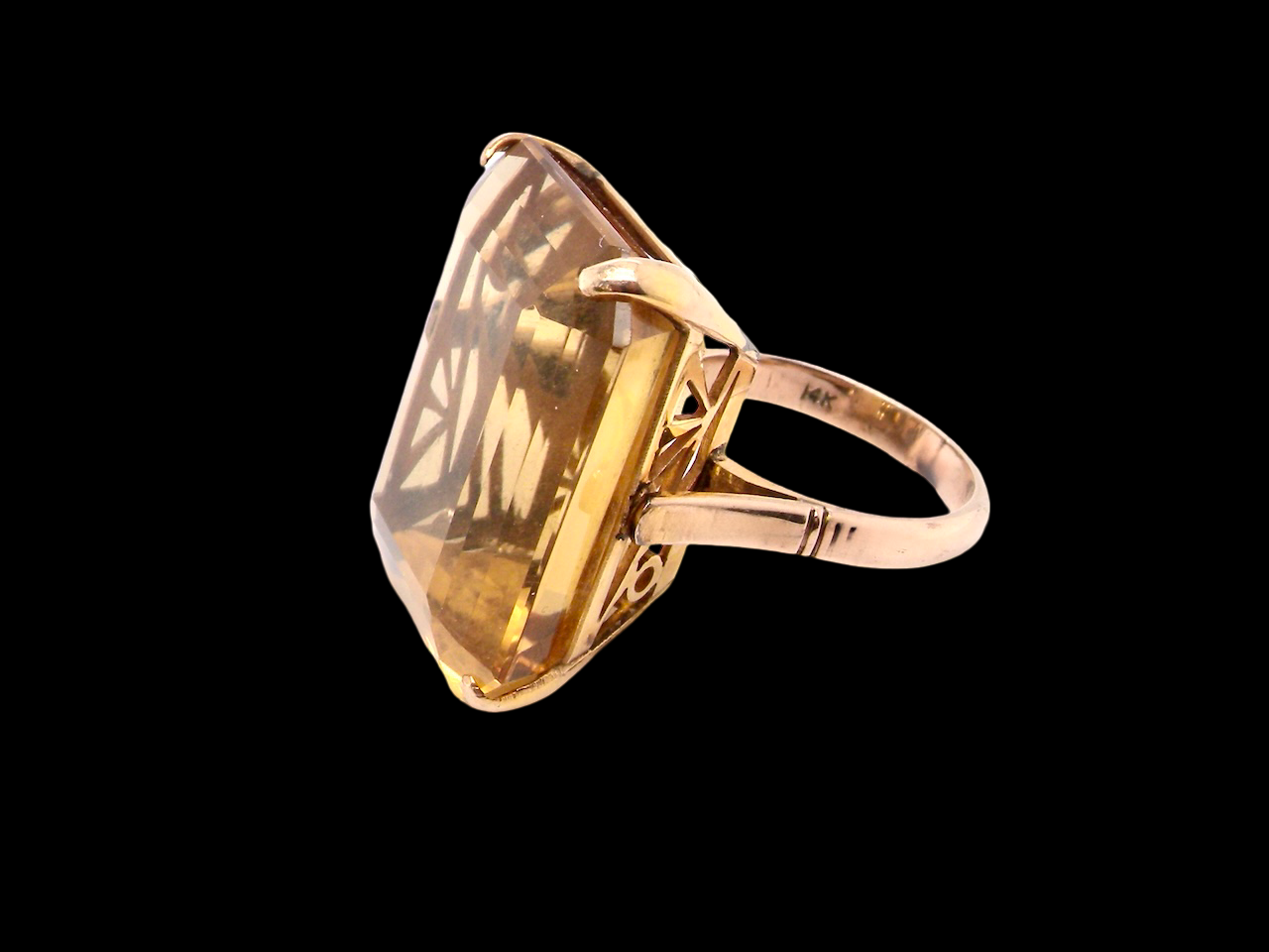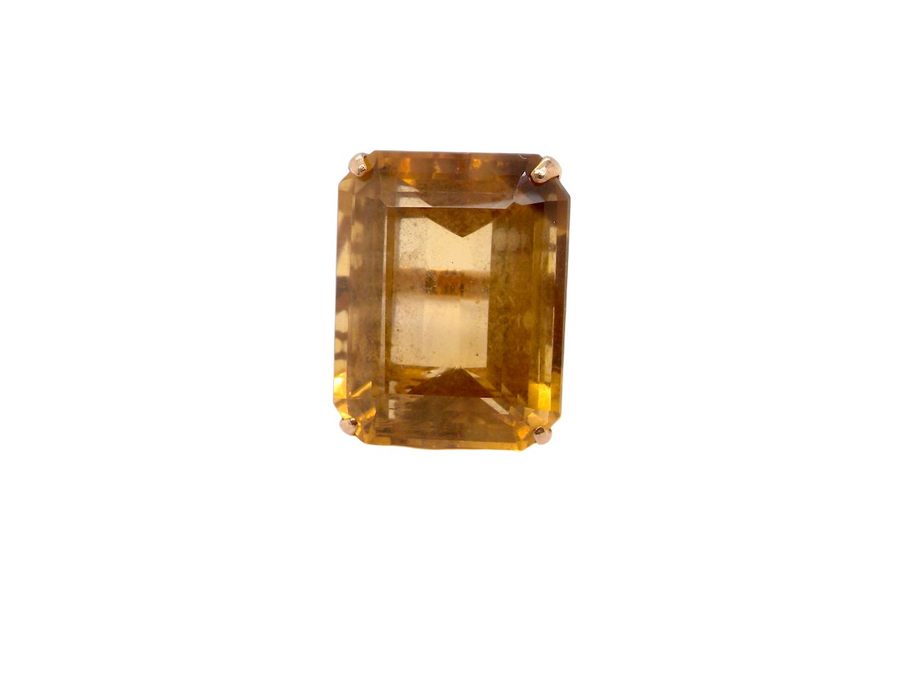 A very impressive dress ring. The large trap cut sherry coloured quartz stone measures 25x19mm, depth 18mm (includes basket undersetting).