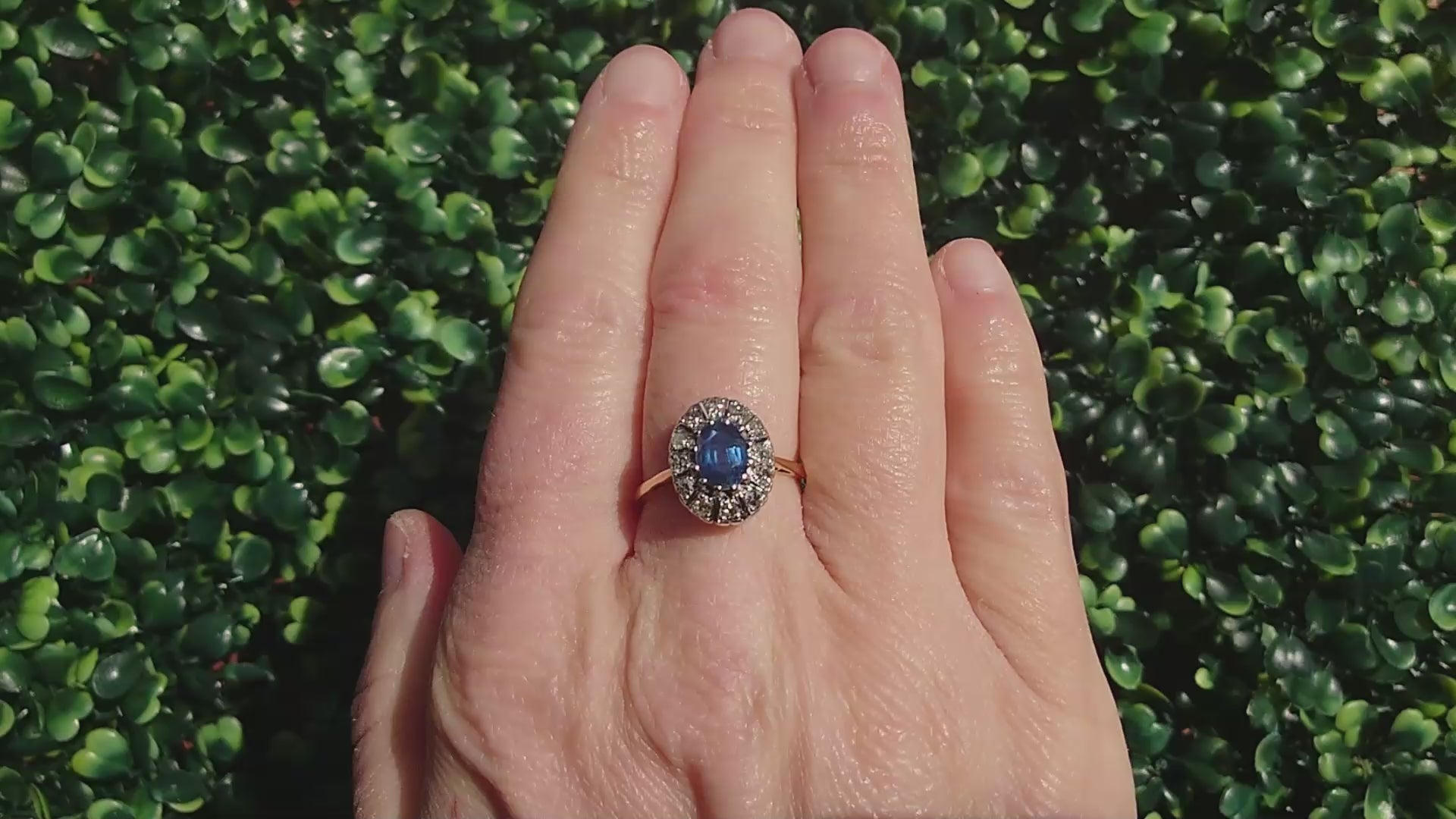 A beautiful vintage cluster ring featuring an oval mid-blue sapphire (approx. 7 × 5 mm), securely claw-set at the centre. Surrounded by a halo of twelve old brilliant-cut white diamonds (approx. 2 mm each, total estimated diamond weight ~0.35 ct), the piece is classically elegant.