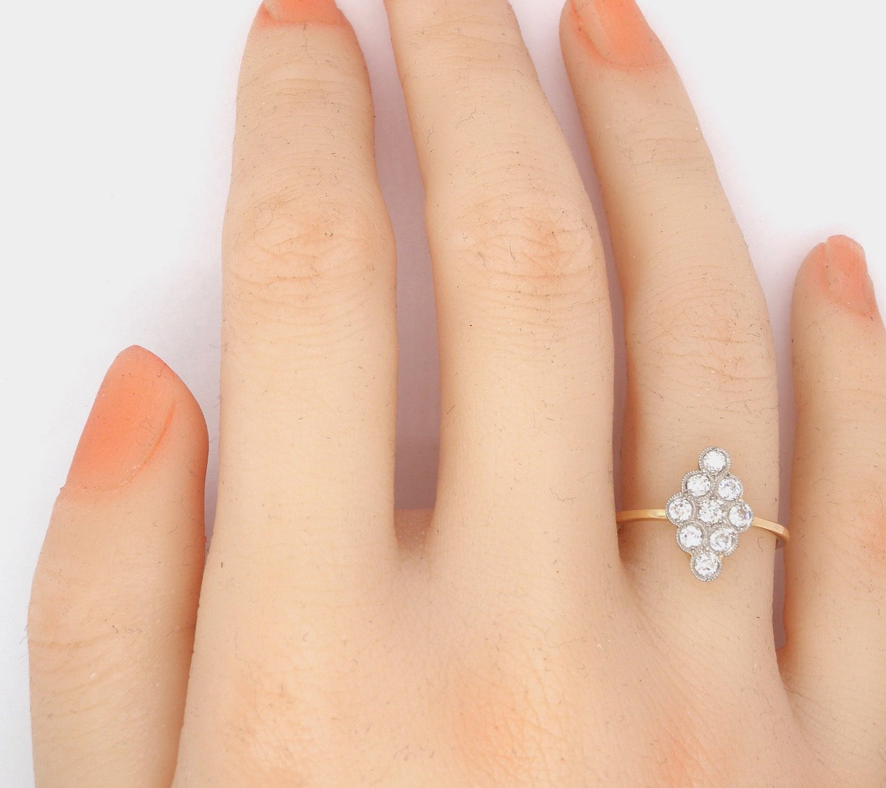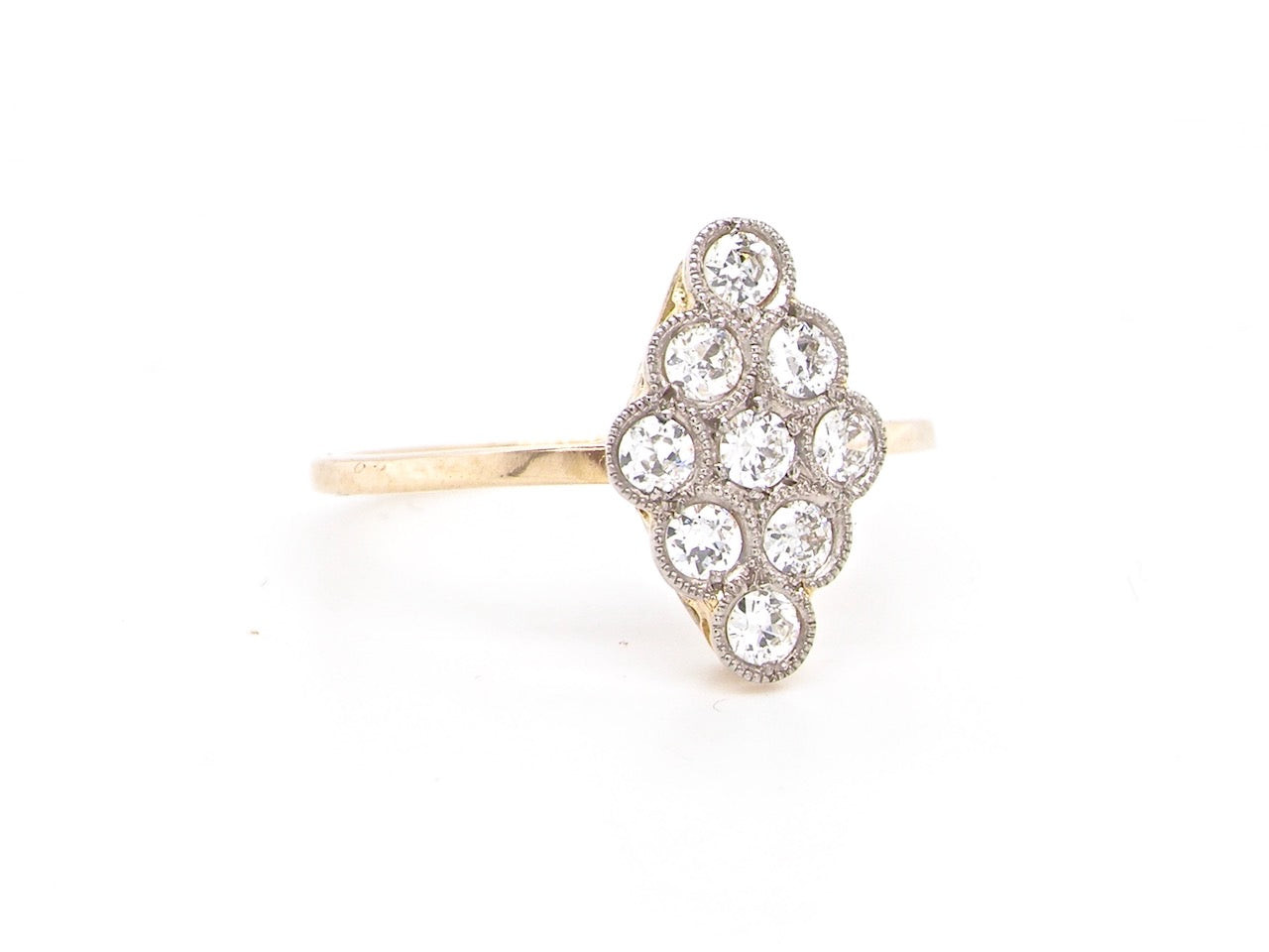 A beautiful Edwardian marquise cluster ring set with nine old brilliant-cut white diamonds, each approximately 0.05 carats, with a combined total weight just under 0.50 carats. The diamonds are well-matched, bright and lively, with an estimated colour H–I and clarity SI.