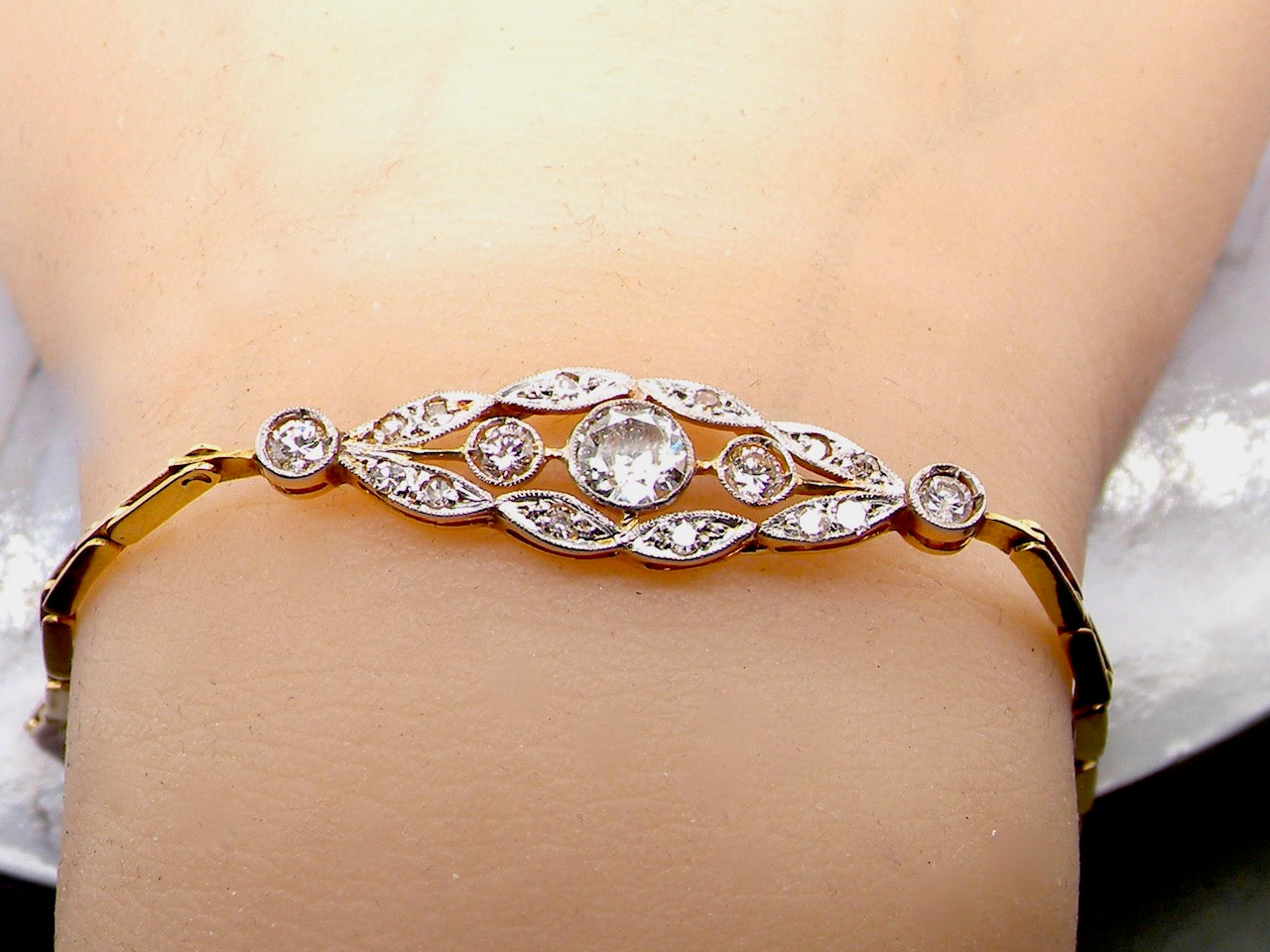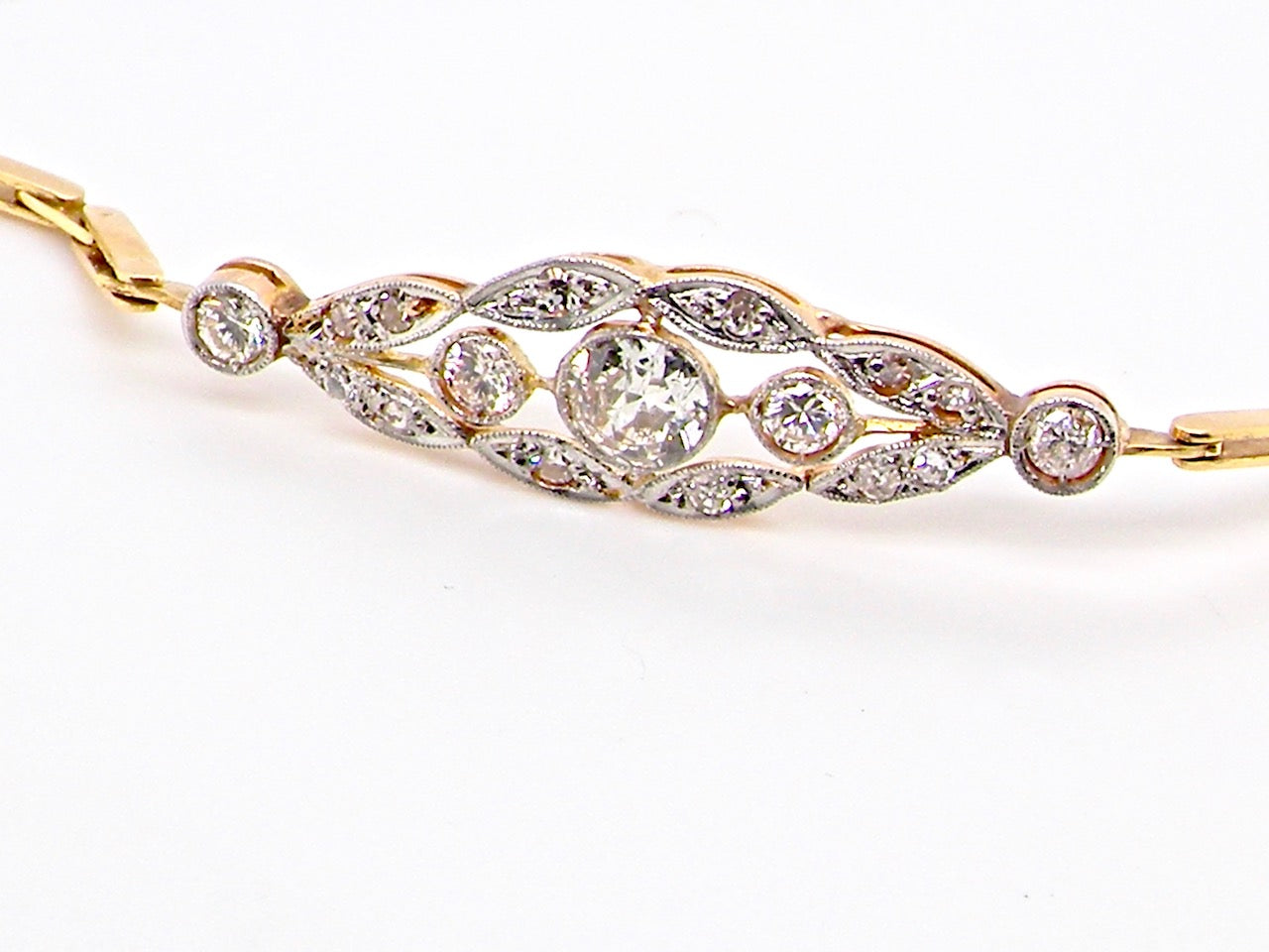 A pretty Edwardian bracelet set with bright old brilliant white diamonds. Principal diamond 5.55mm (estimated at 0.60 carats) colour H-i, clarity Si.