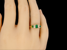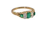 A fine early 20th century ring. The emeralds are bright and exceptionally clean. The centre stone 5x3.6mm, the end emeralds 3x2.8mm. Deep green grass colour, to the naked eye clean, under an eyeglass some natural inclusion.