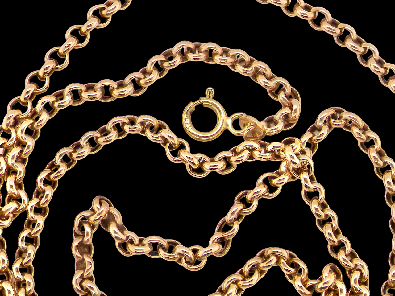 Round belcher links, each 3.8mm. Bolt ring clasp stamped 375, tests as 9 carat gold as does the chain.