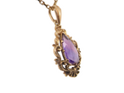 A 9 carat gold pendant that features a pear shaped amethyst centre stone. Measures 14.5x7.5mm, the setting a Victorian style faithfully reproduced in ornate style.