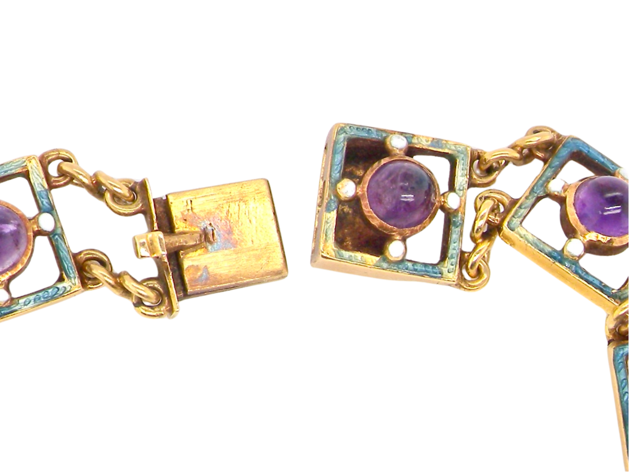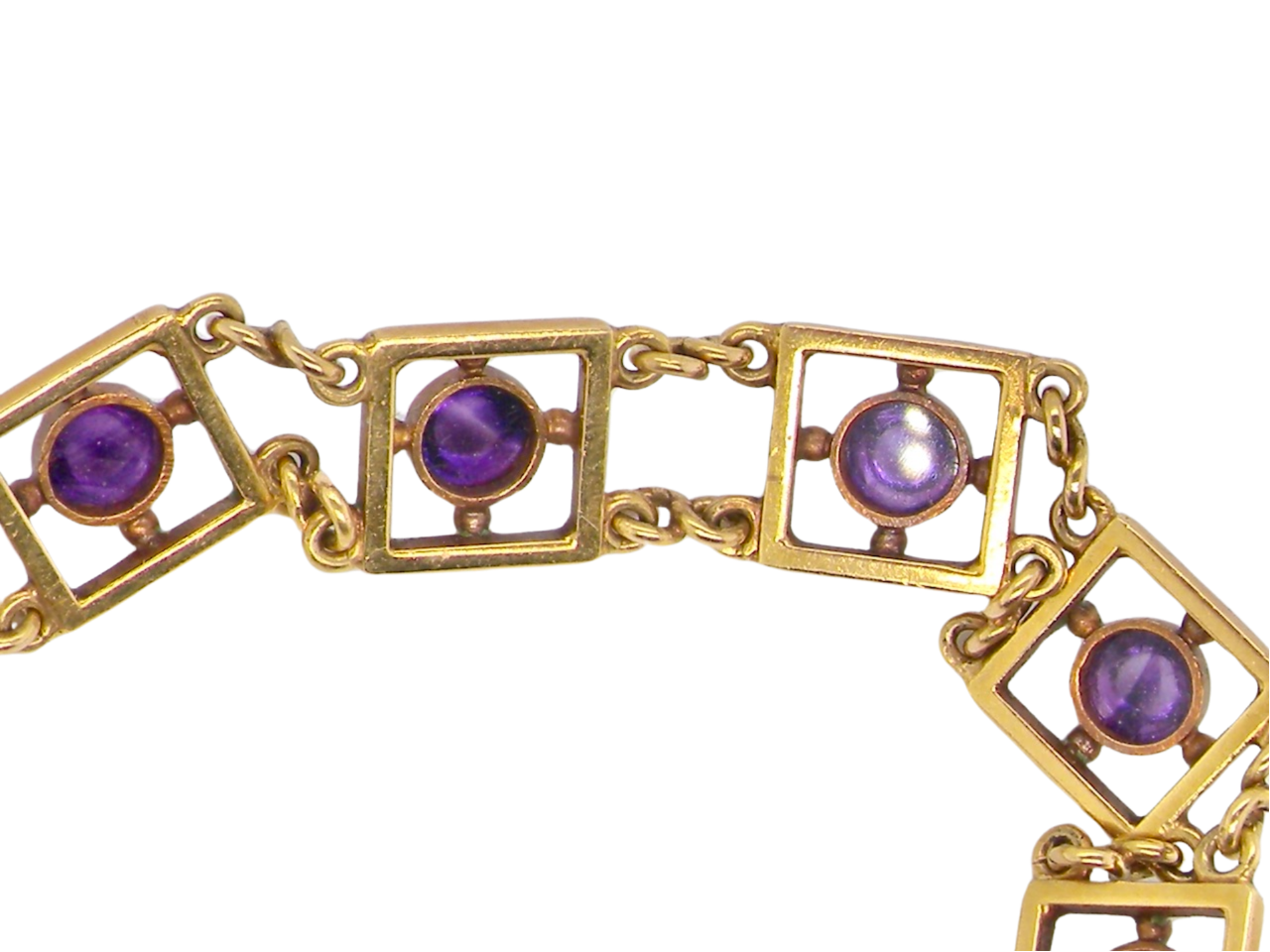 An antique bracelet, probably from the Arts and Crafts period, late 19th century. This lovely bracelet has twelve matching openwork squares, each set centrally with a 4.5mm cabouchon cut amethyst.