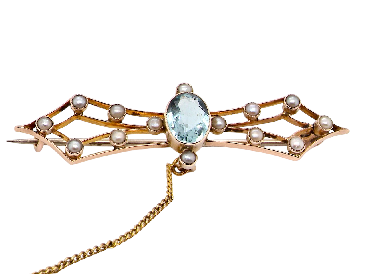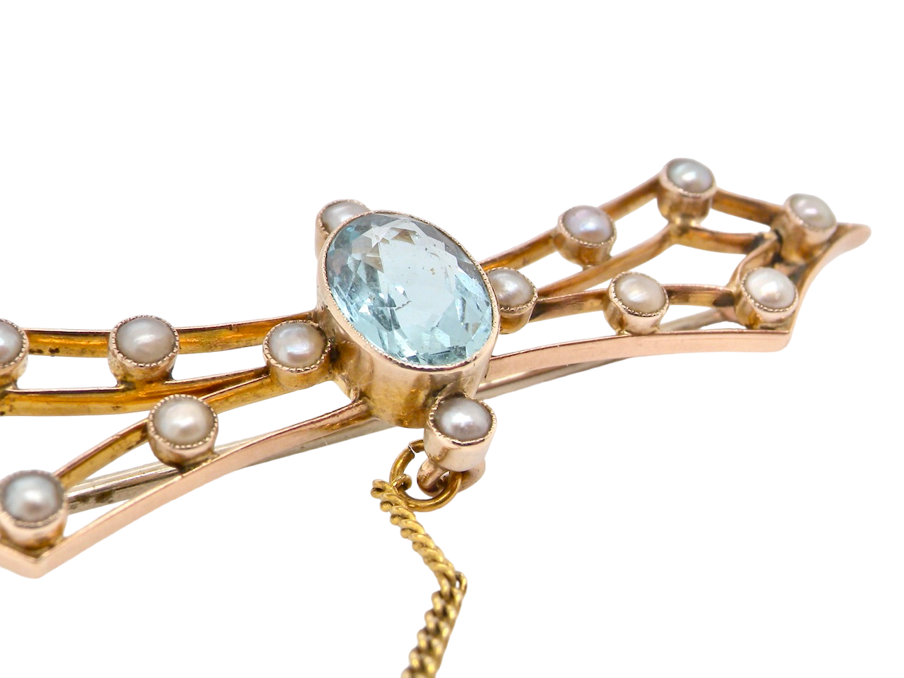 Within this are set a total of fourteen 2mm seed pearls. Brooch width in 50mm, height at the widest is 10mm, weight 3.8grams. No hallmarks were required for this period. Testing as 9 carat gold. A safety chain is added for extra security.