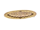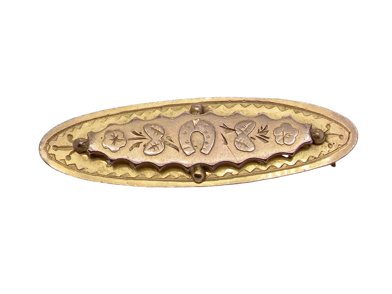 A late Victorian bar brooch with applied decorations of flowers and leaves and a good luck symbol of a horseshoe .