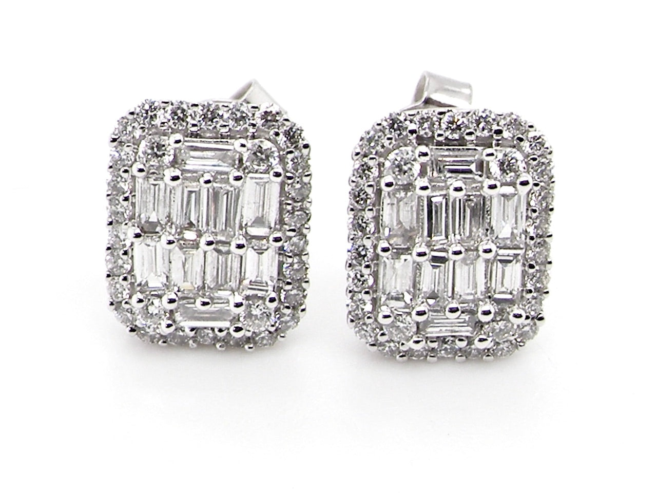 These are rectangular stud earrings each set with mixed cut of white diamonds with a total in each earring of ten baguette cut diamonds and twenty six small round white diamonds to a carat weight of 0.37 carats, total for both 3/4 carat. Colour H-i, clarity Si.