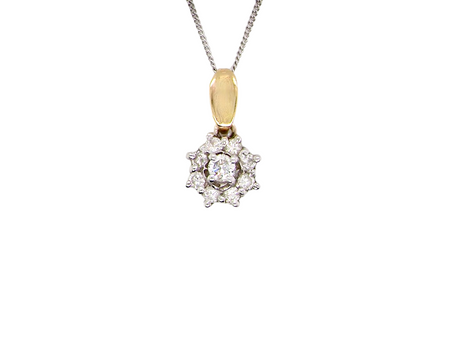 This sparkling diamond cluster pendant features a 3mm brilliant cut centre diamond surrounded by eight small diamonds. Claw set in 18 carat white gold. 8.5mm diameter and attached to a yellow gold bale, which is hallmarked in 1984.