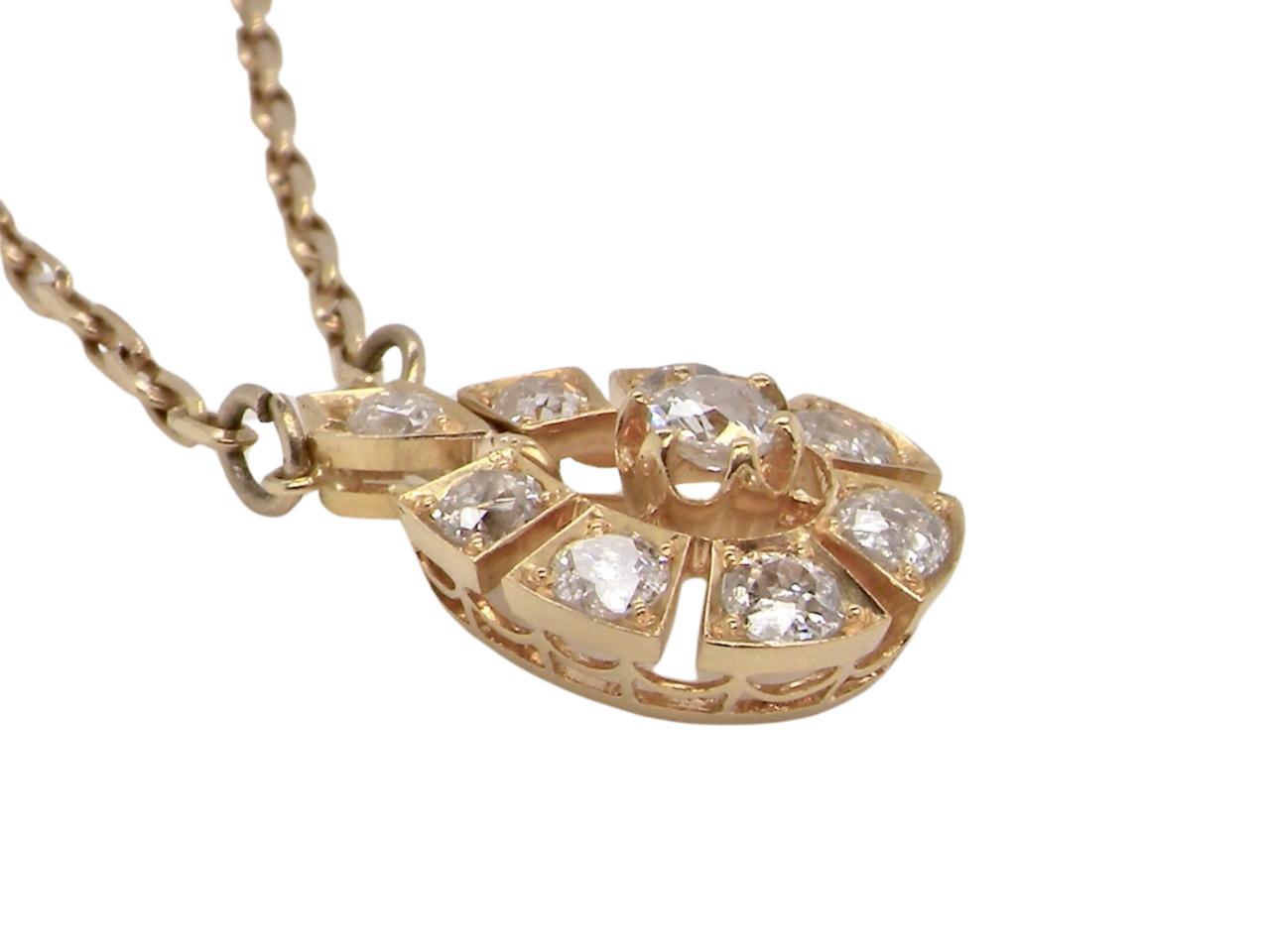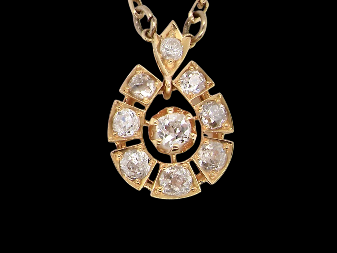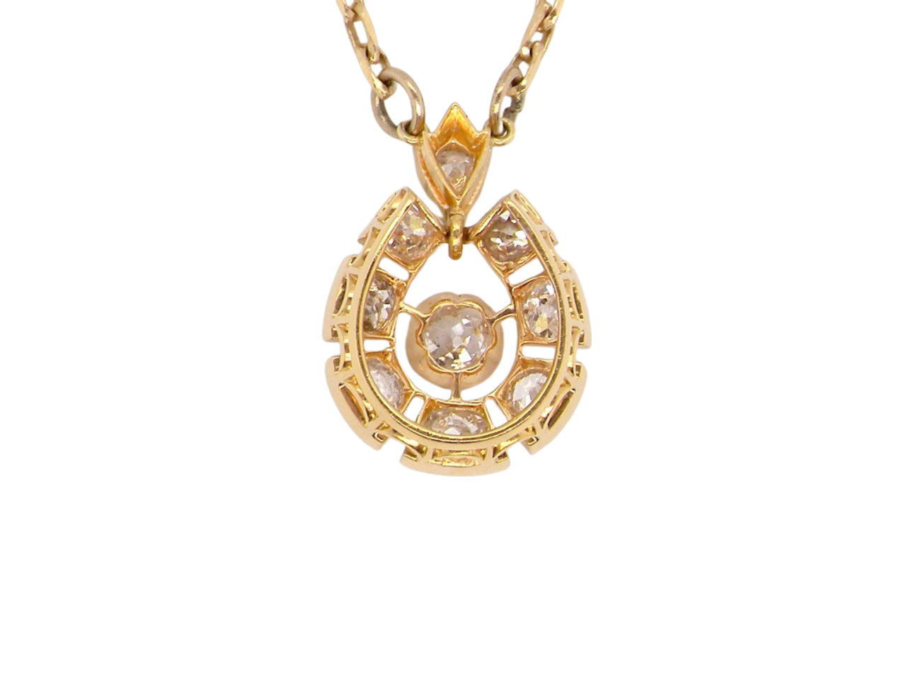 Diamonds Si1-2 clarity , G-i colour. 20x15mm, testing as 15 carat gold, no hallmarks as before a legal requirement. Attached to a fine belcher link neck chain. Total weight 6grams.