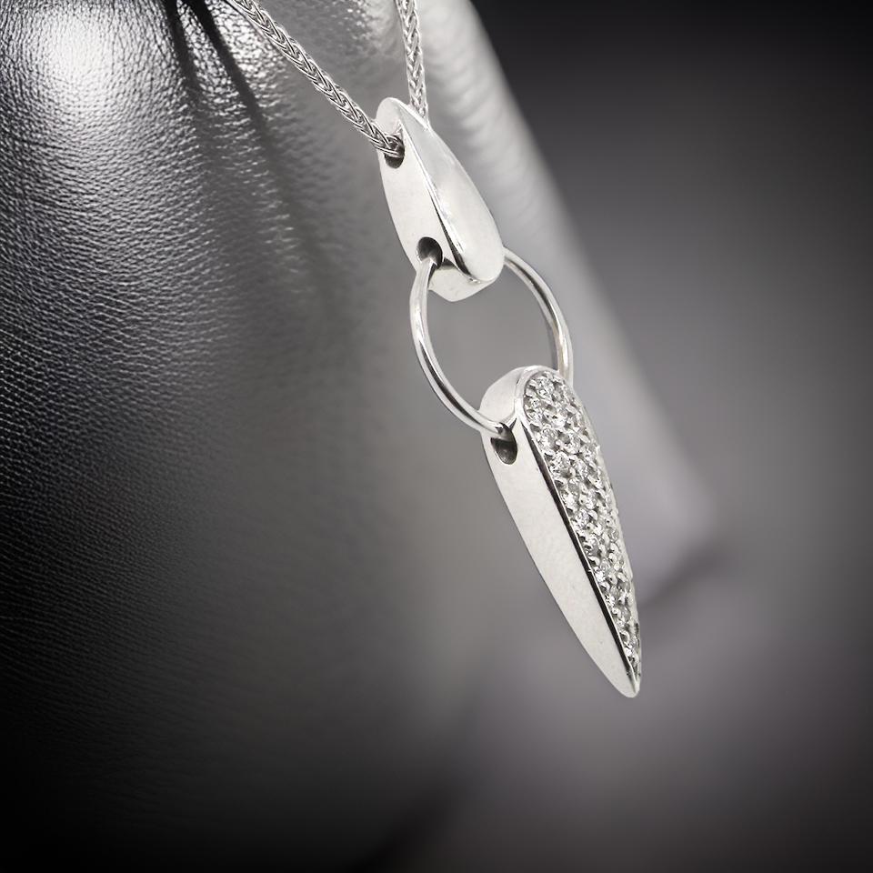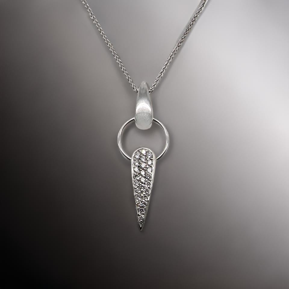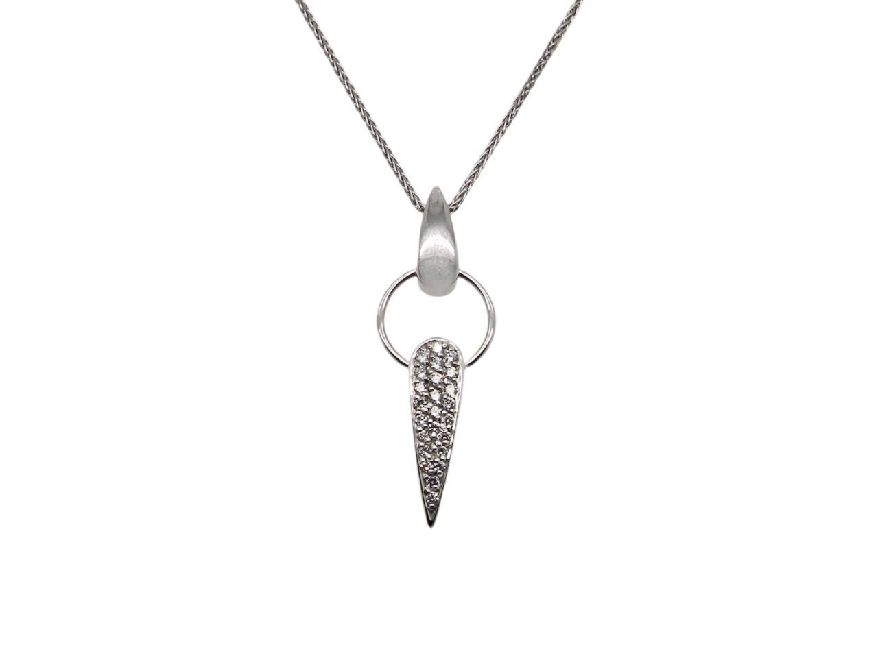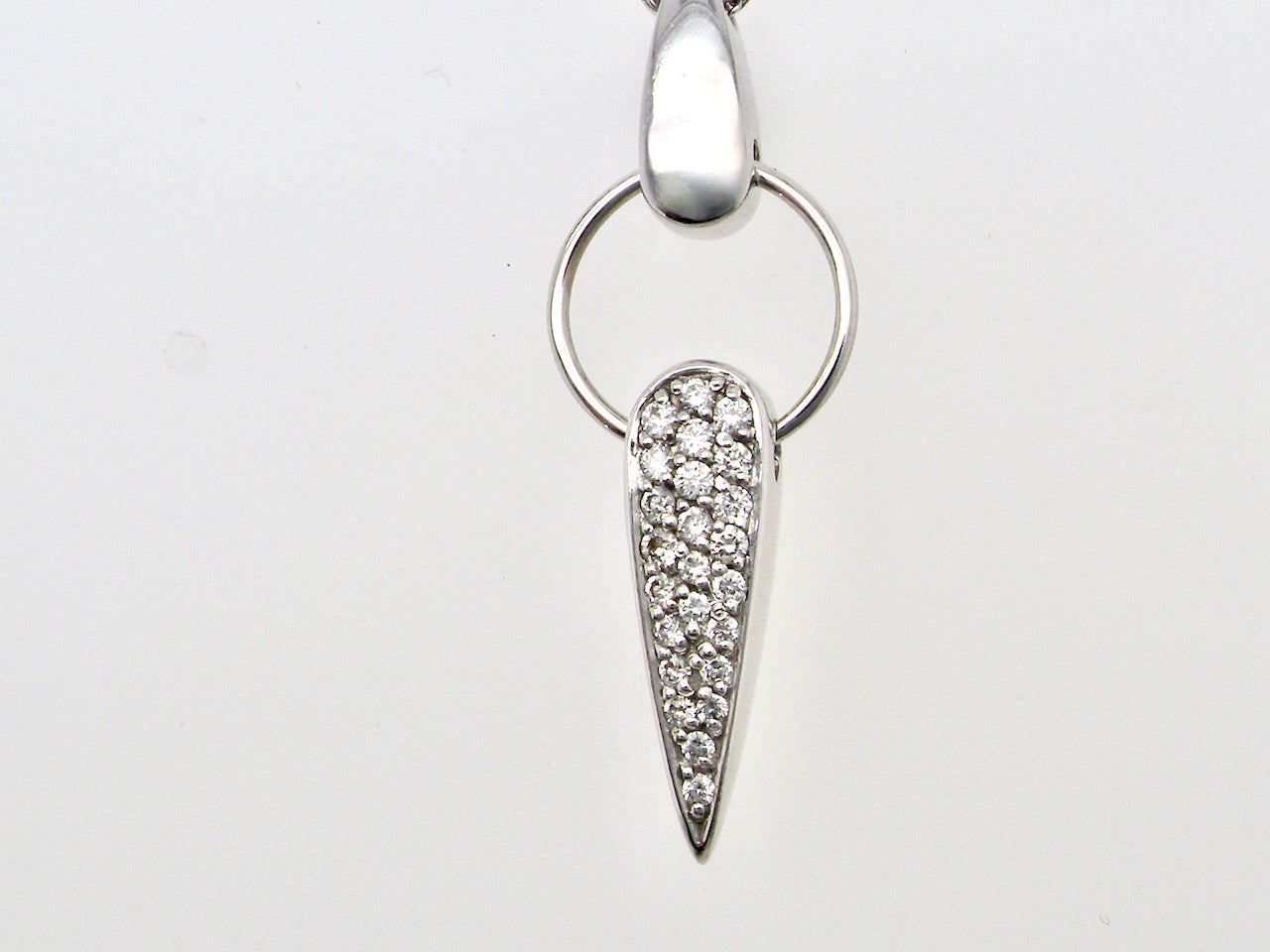 A white gold pendant with a pear shaped drop that is pavé set with brilliant cut white diamonds that have a combined carat value of 0.30 carats (confirmed on the reverse)