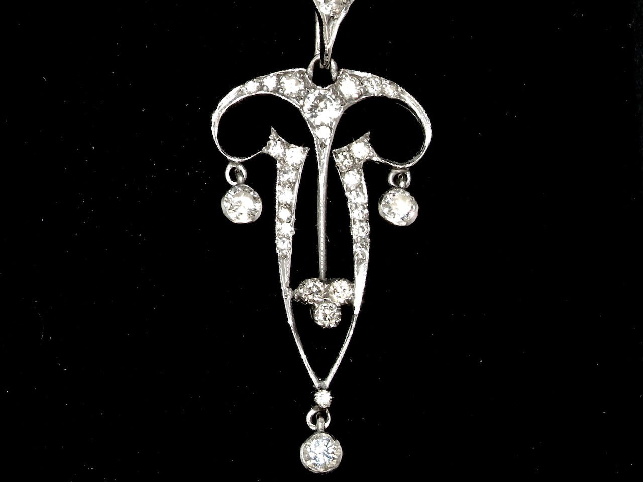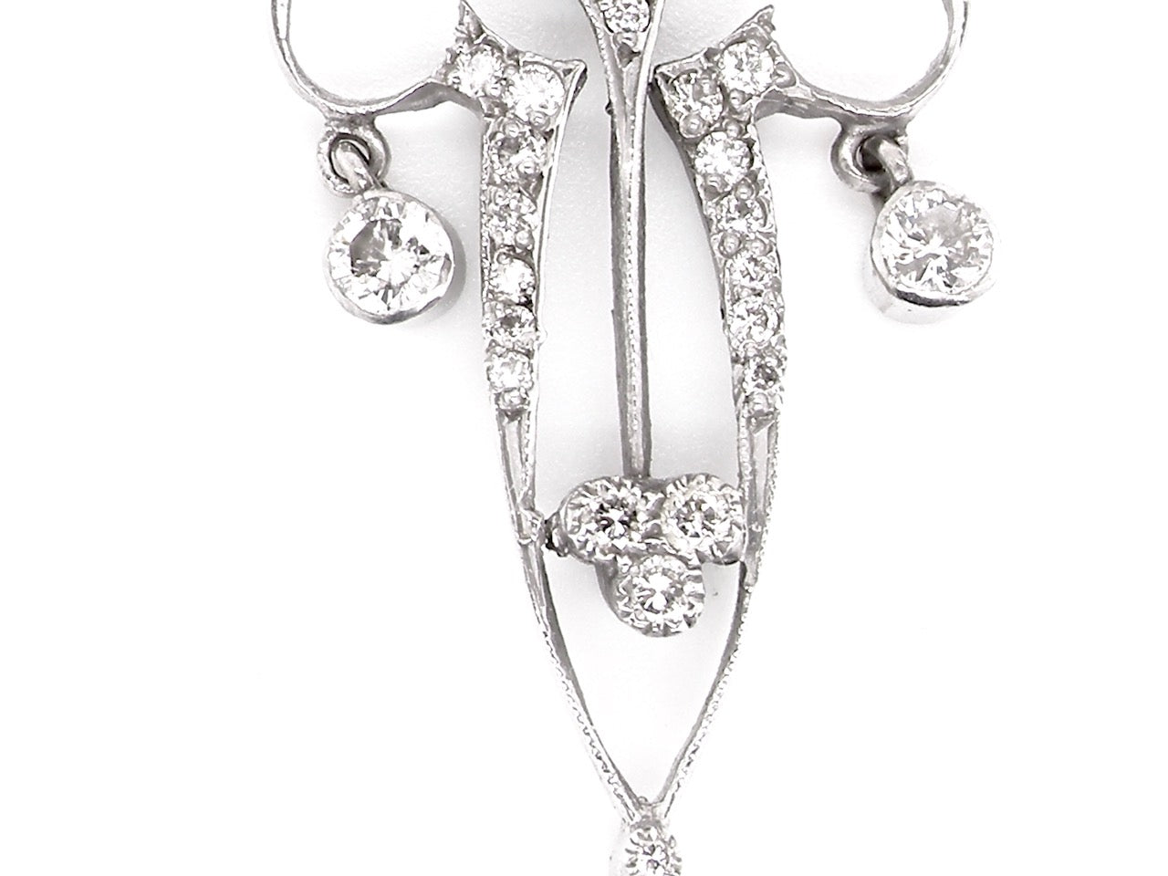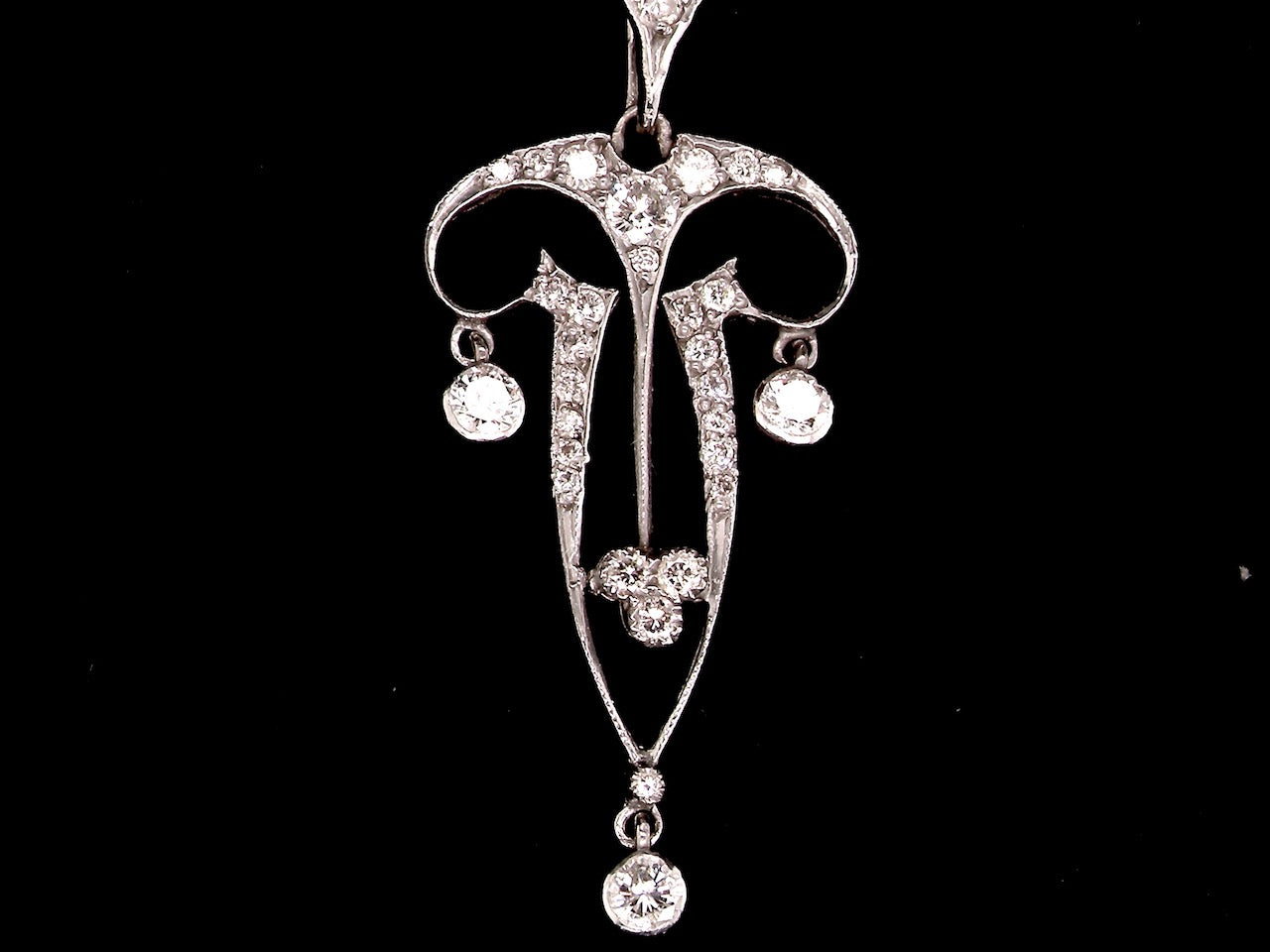 A pretty Art Deco pendant containing around twenty five old cut white diamonds from 0.005 carats through to 0.10 carats, some articulate from each side and the base. Total carat weight estimated at 0.50 carats.