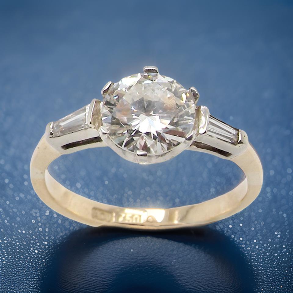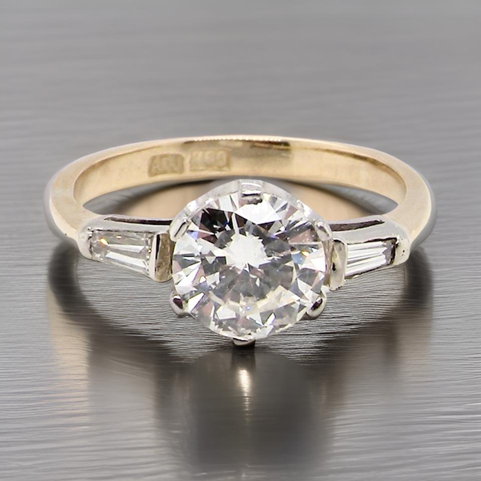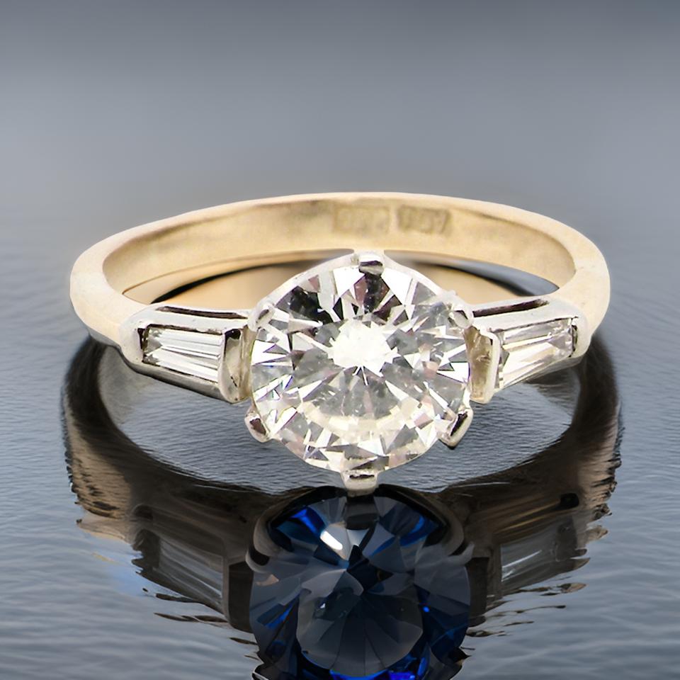 Each side a tapered baguette shaped diamond, 3.5x2mm (0.10 carats). Head including shoulders 16mm, height 8mm, weight 2.2grams. Period 1920-1930, shank tests as 18 carat yellow gold. Total carat weight of 1.33 carats. No hallmark legally required for the period.