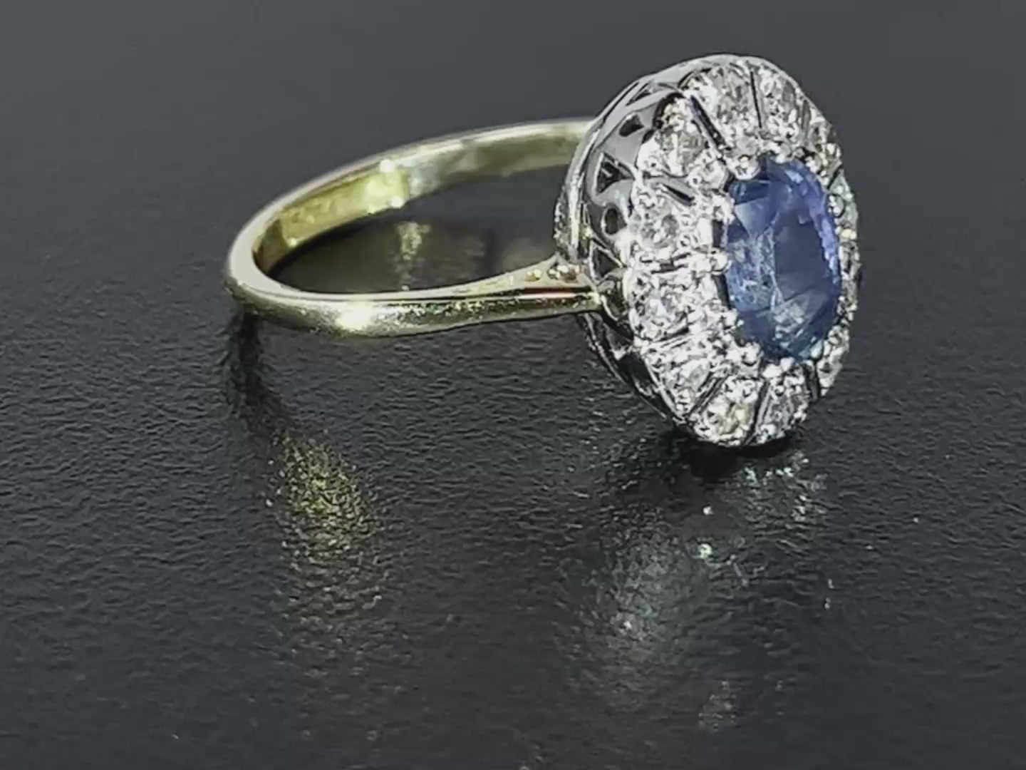 A beautiful vintage cluster ring featuring an oval mid-blue sapphire (approx. 7 × 5 mm), securely claw-set at the centre. Surrounded by a halo of twelve old brilliant-cut white diamonds (approx. 2 mm each, total estimated diamond weight ~0.35 ct), the piece is classically elegant.