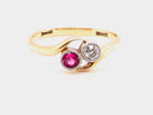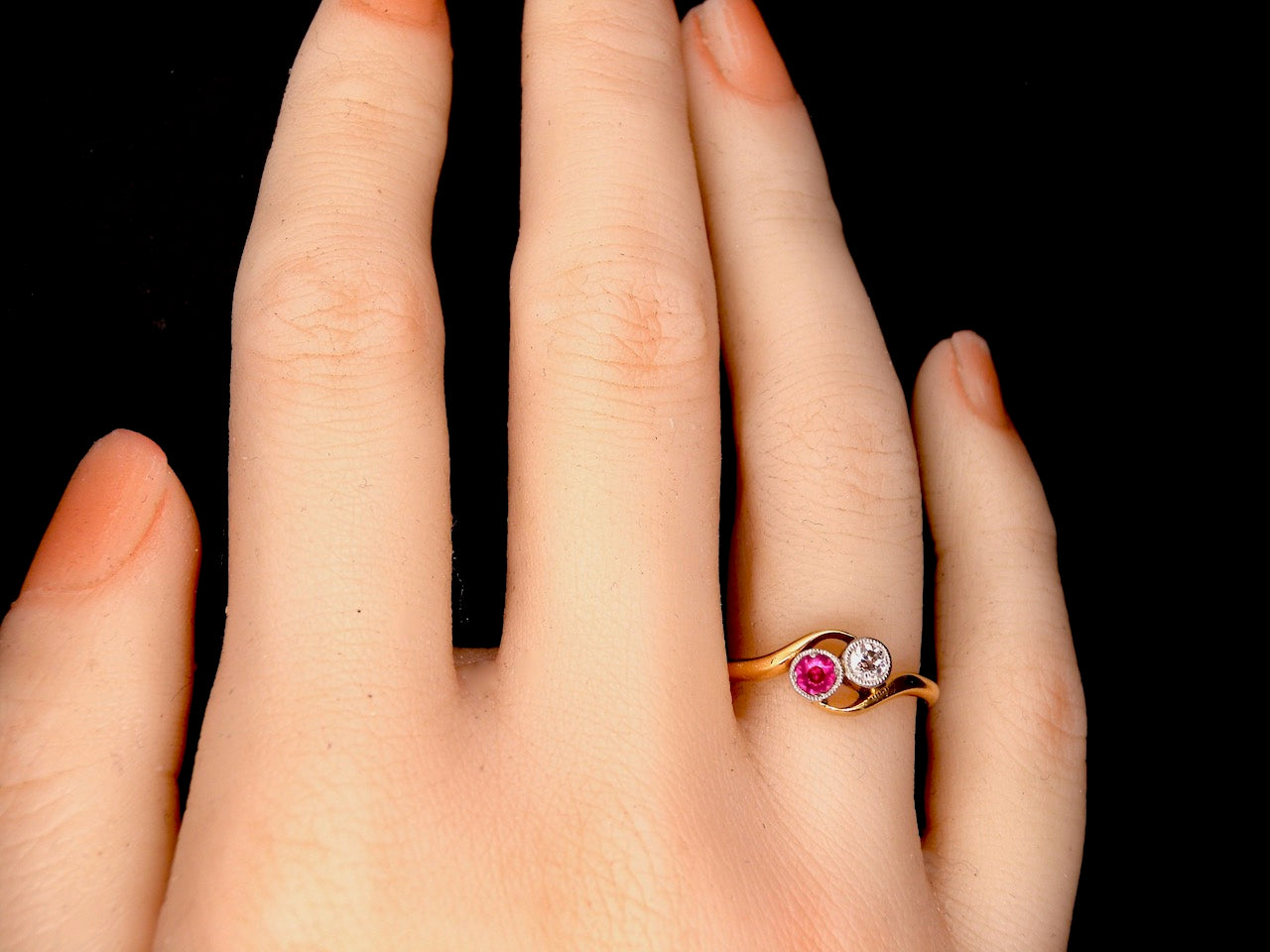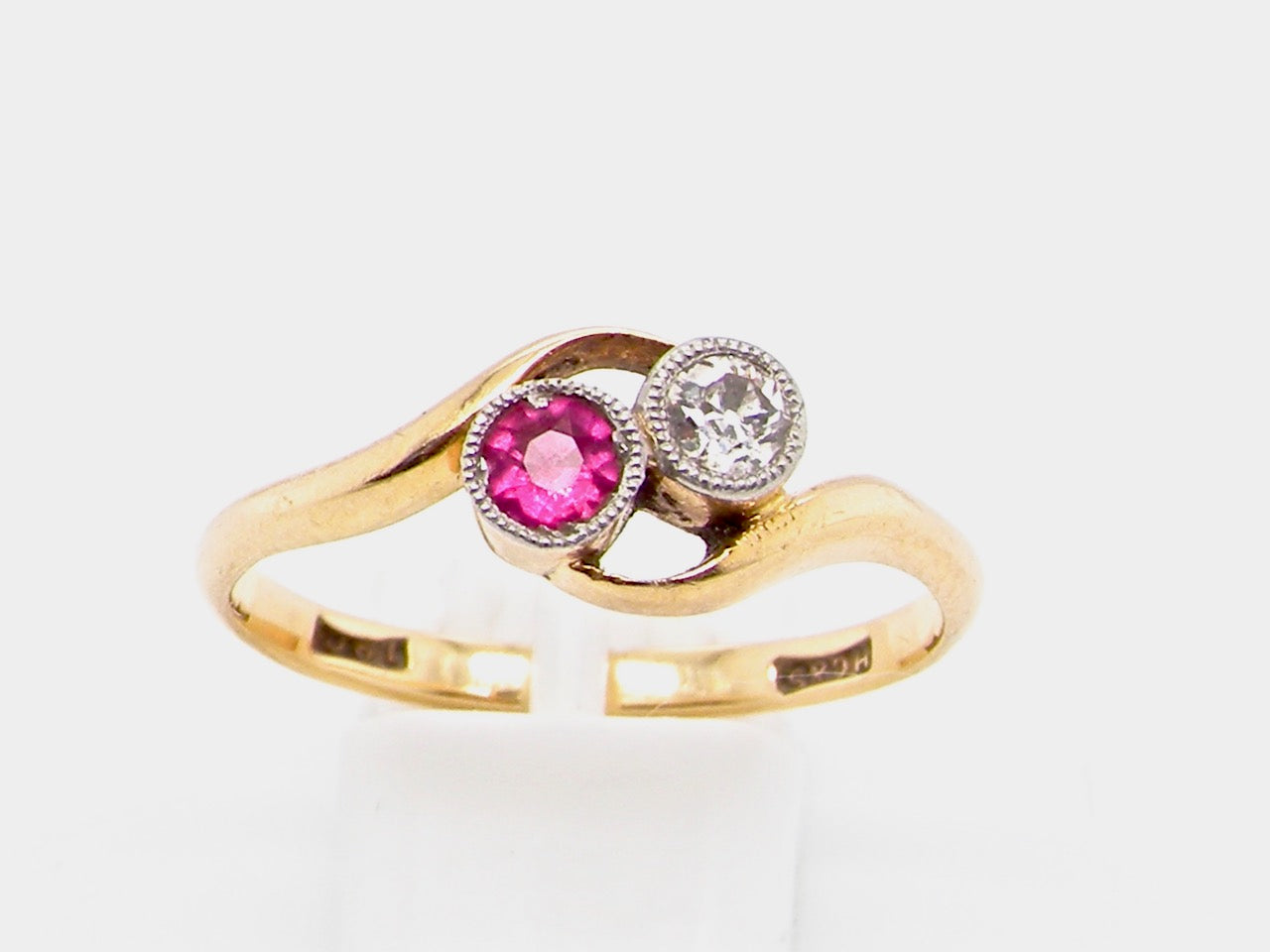 A vintage cross over style ring containing a pink red ruby 3.3mm mille grain set in platinum and an old brilliant cut white diamond 3mm (0.10 carats) also set in platinum.
