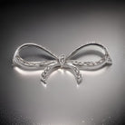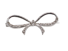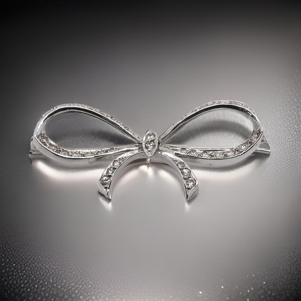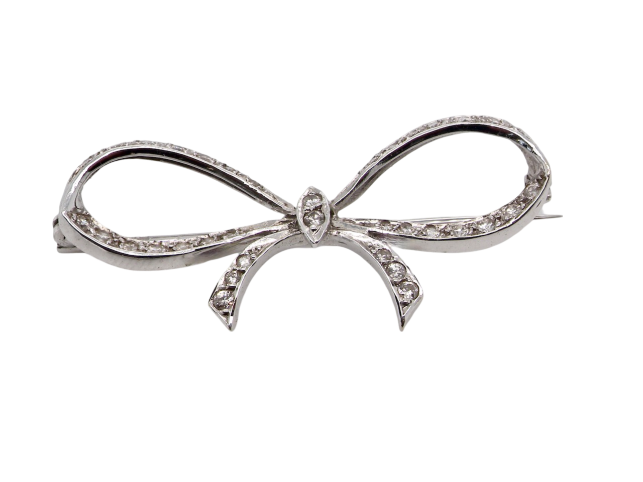 A pretty brooch in the shape of a brooch. Set with many small white diamonds .