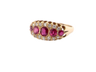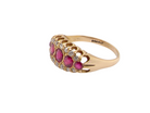 A pretty antique boat shaped ring. Pink red rubies adorn this ring across the centre and graduate from 2mm to the middle stone at 4.5mm.