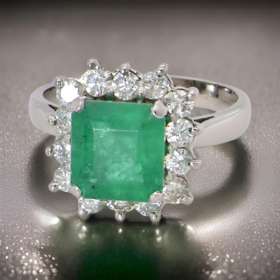 An 18 carat white gold cluster ring. Features a large square emerald centre stone, 8.3x7.8mm (2.25 carats) . Deep green grass colour, natural inclusions as with most emeralds.