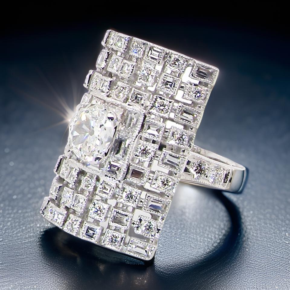 At the centre is a principal old-cut diamond measuring approximately 6.3mm (0.70 carats), with an estimated colour H–J and clarity VS. Surrounding the centre stone is an impressive mix of diamond cuts, including carré cuts (step-cut square diamonds with long, elegant facets), baguette cuts, and round brilliant diamonds.