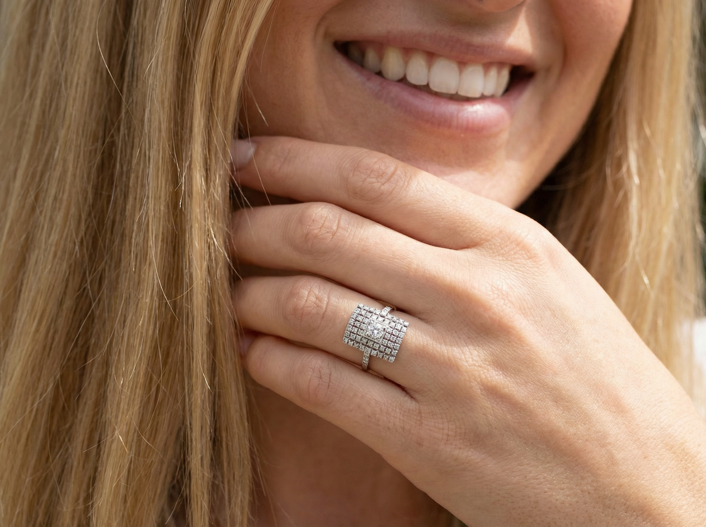 This striking ring features a beautifully balanced arrangement of diamonds set into a large, slightly curved plaque designed to sit comfortably around the finger.