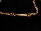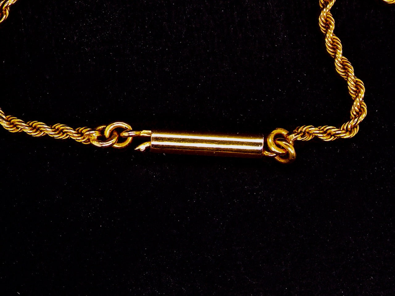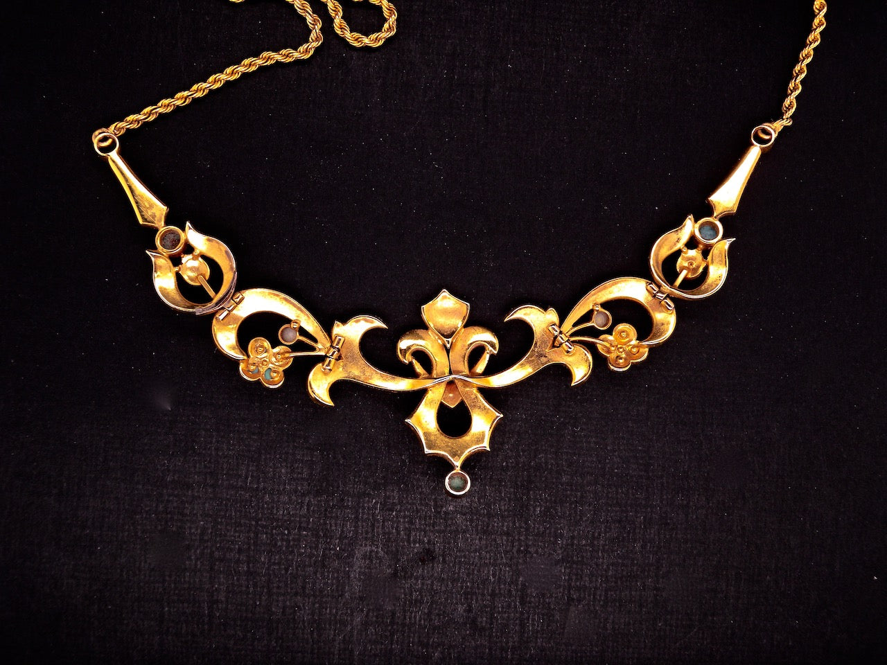 The decorative centre portion is 12cm across, width at the centre 3cm. Connected to a yellow gold rope chain. Barrel clasp, stamped 15CT, tests as 15 carat gold but no hallmark as this was not a legal requirement.