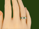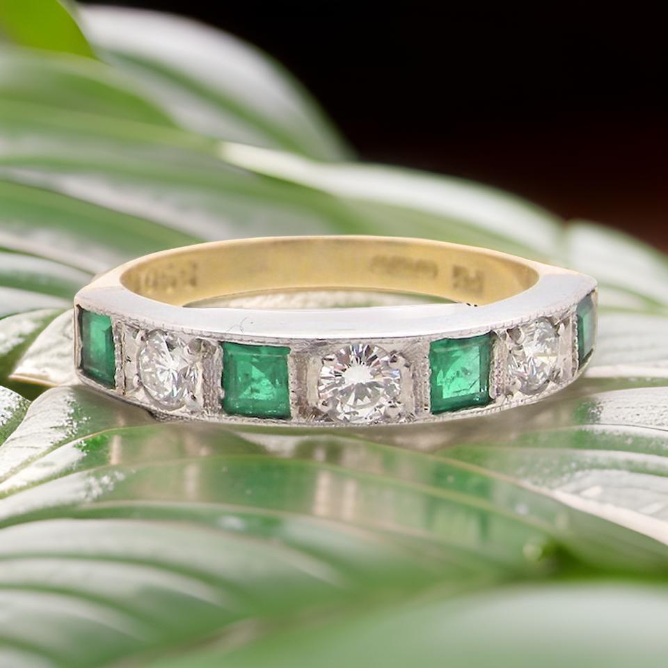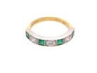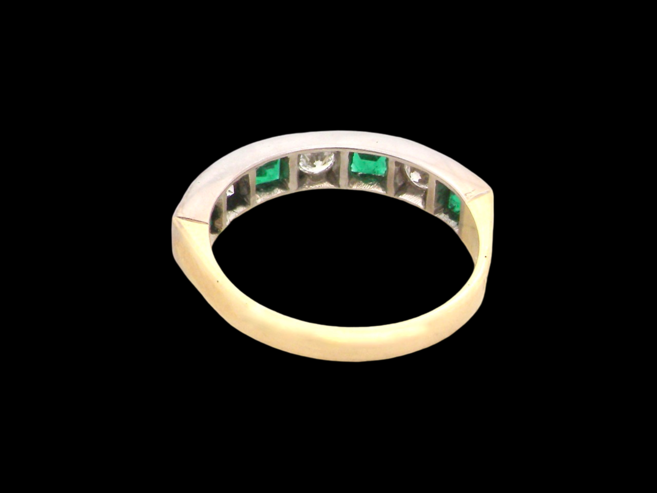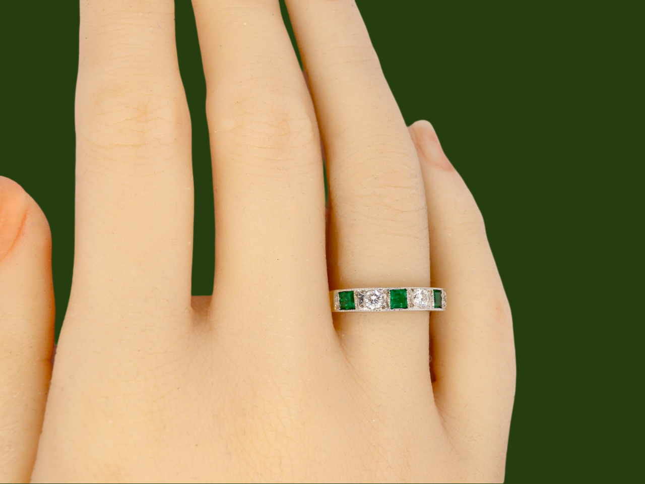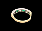 An 18 carat gold half hoop eternity ring. Set with four calibre cut emeralds, each 3x3mm, deep moss green colour, mille grain set.