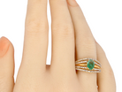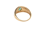 A modern gem ring containing an oval emerald centre stone 7x5mm, mid green colour with good clarity and just a few natural inclusions. 18 carat yellow gold.