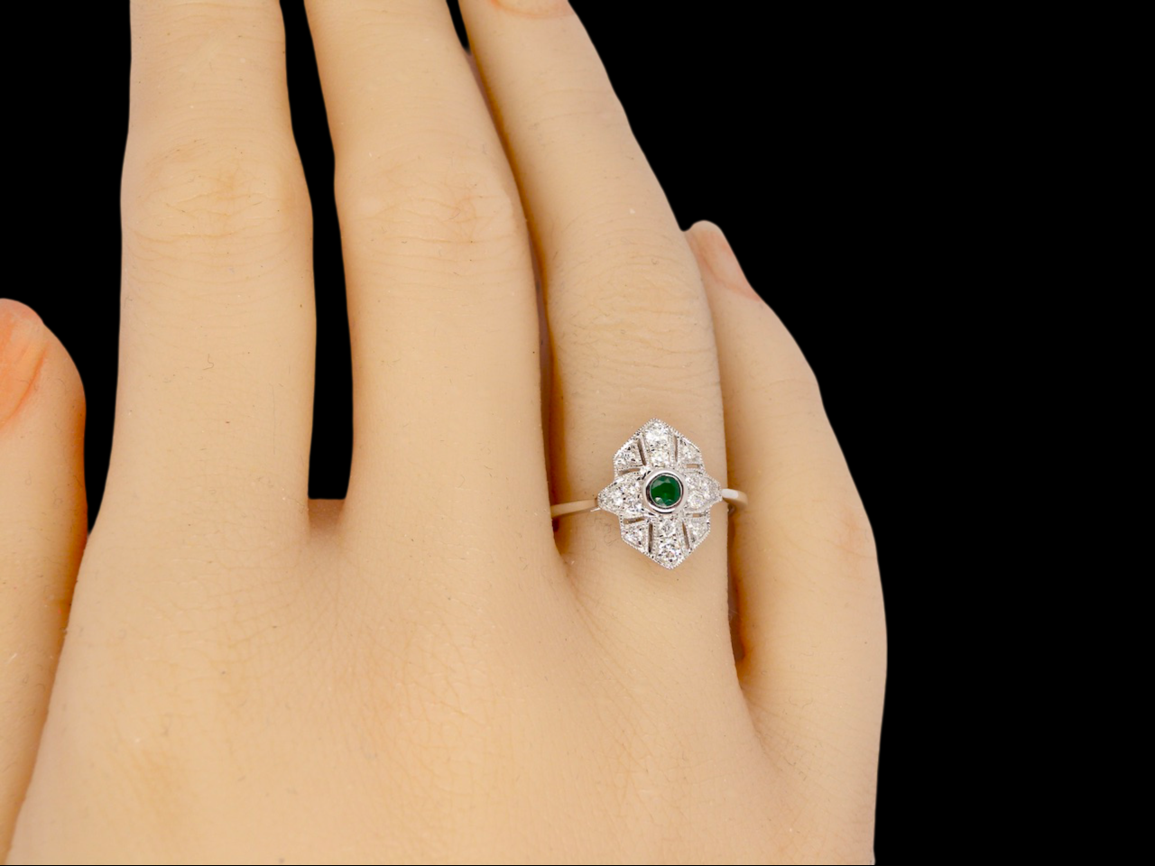 A pretty Art Deco style cluster ring. Centre stone a round emerald 3mm diameter, rub over setting.