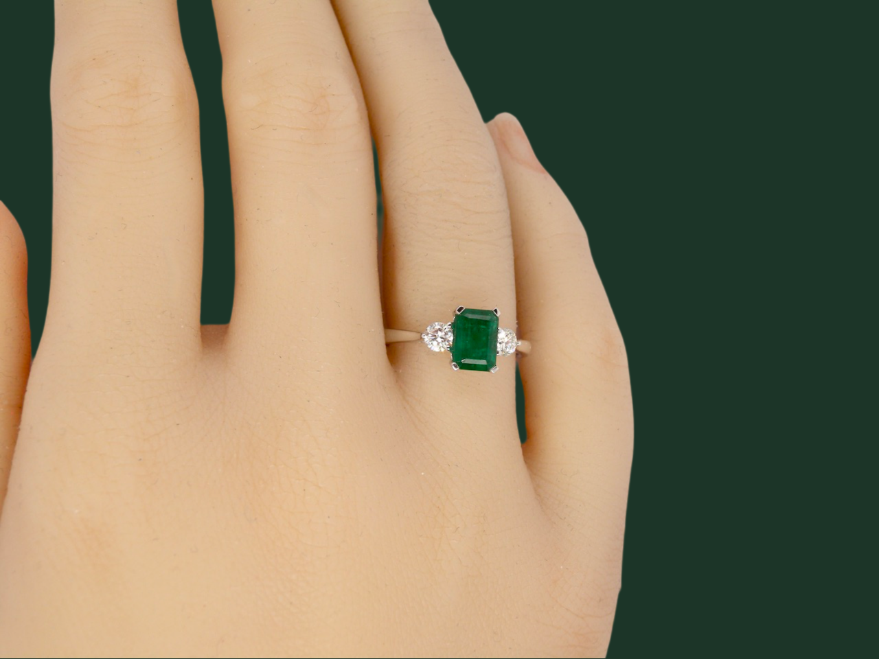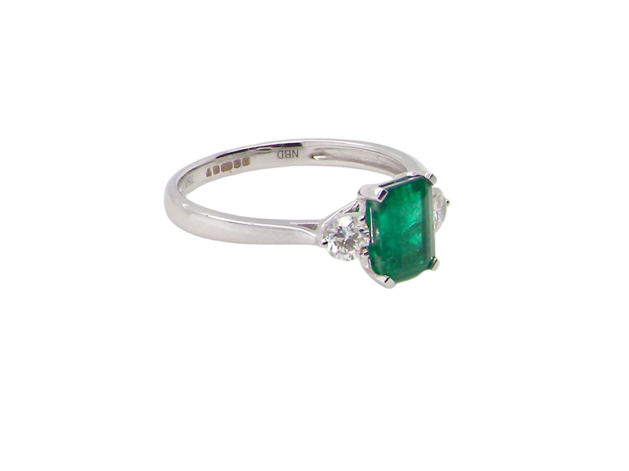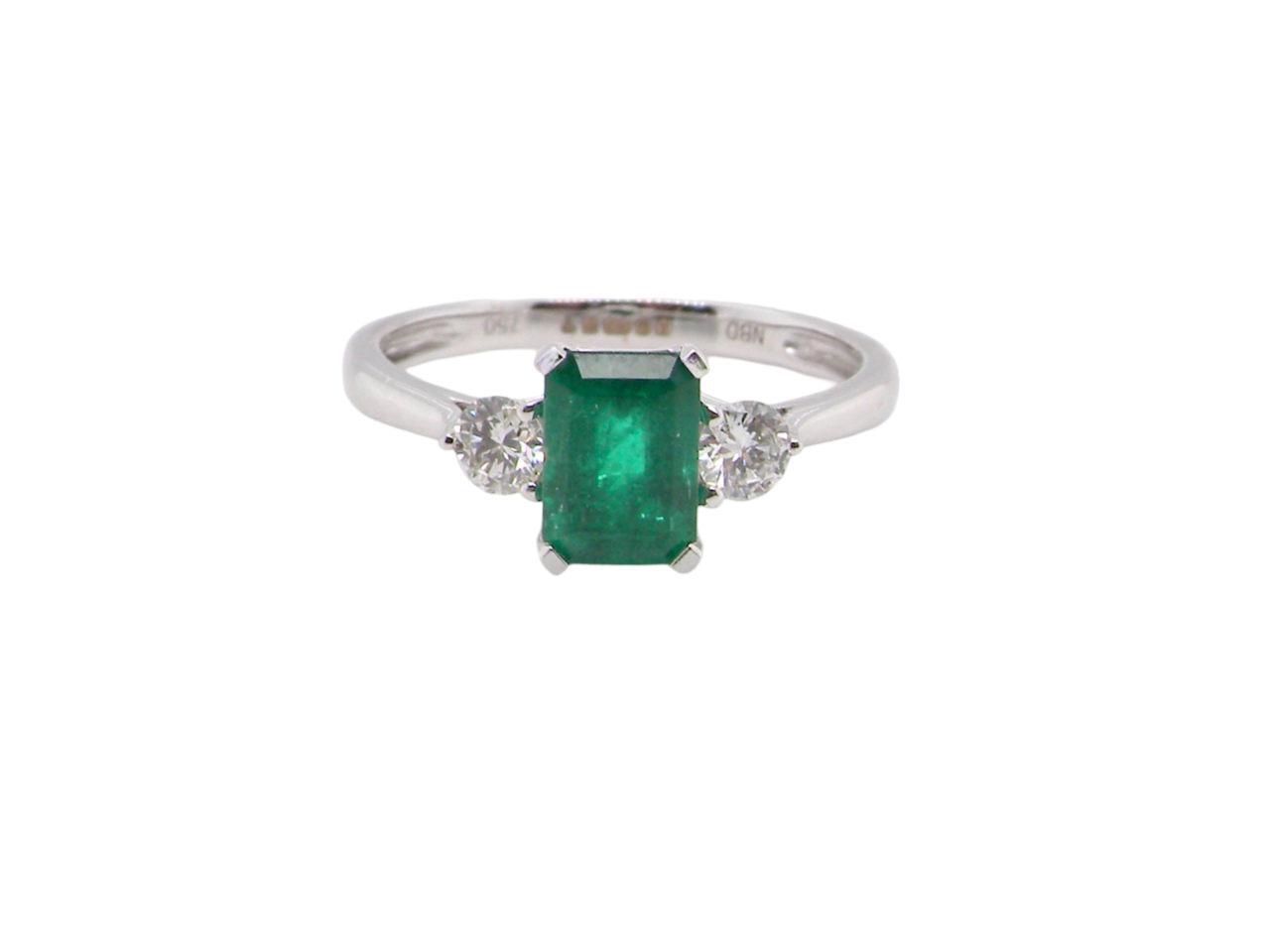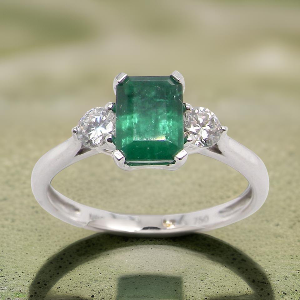 An 18 carat white gold trilogy ring. The centre stone is a dark forest green emerald, natural inclusions under an eye glass would suggest no enhancement. 7x5mm (est 1 carat).