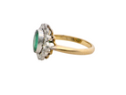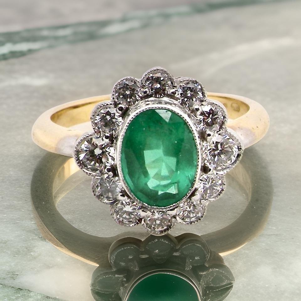 A beautiful cluster ring. The emerald at the centre is oval cut, grass green colour, 8x6mm (est 1.25 carats) with good clarity with luminescence flashing from the rear of the stone. Mille grain setting.