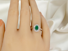 Features an oval cut emerald centre stone, 7x5mm  (0.75 carats) deep grass green hues.