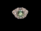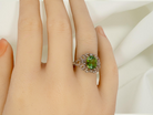 An antique ring that features an oval cut green garnet, 8x7mm, lime in colour and similar to a peridot.