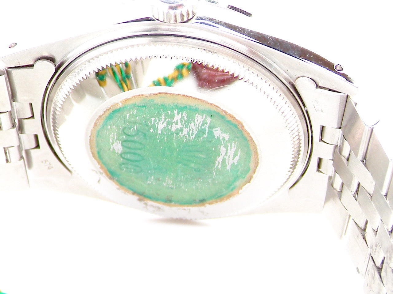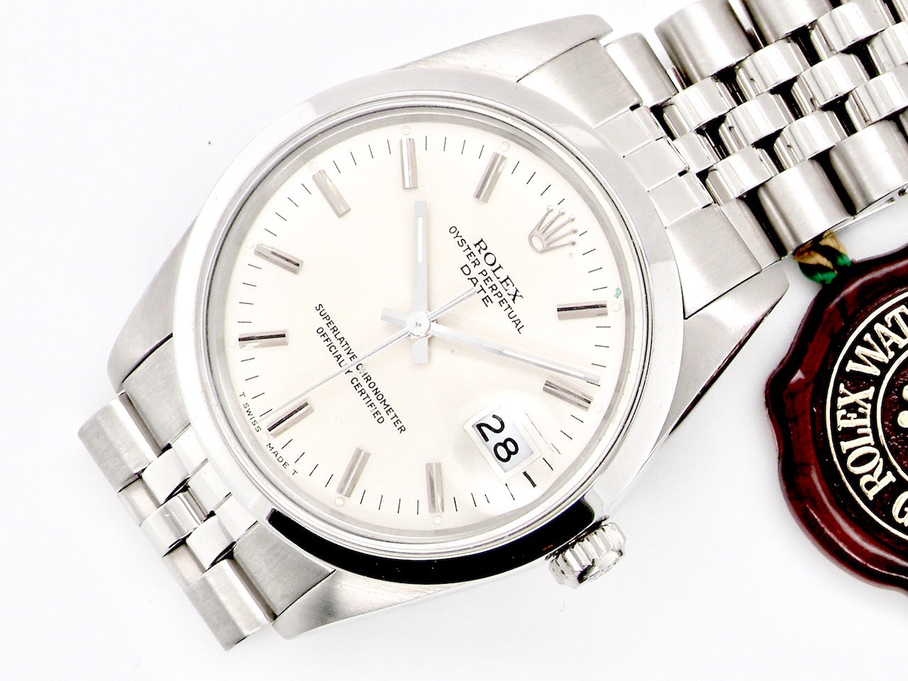 Rolex logo on a crown. Stainless steel smooth bezel. Acrylic crystal with cyclops magnifier. Silver dial with raised baton hour markers. Date window at 3 o'clock aperture. Stainless steel oyster bracelet with fold over clasp. Fits 7 1/4" wrist. Year 1988.