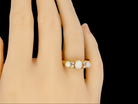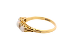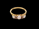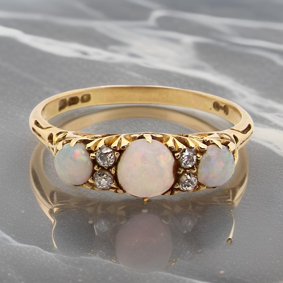 An 18 carat gold vintage dress ring. Set with three white opals, centre stone 6mm, each end a 5mm opal. Good play of colour with many hues of colour when played against the light, including fireglow orange, peacock green, electric blue.