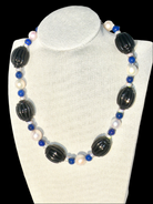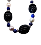 Strung with 10mm cultured pearls, 8mm lapis lazuli beads, and crystal rondell spacers.