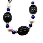 A stunning necklace which features carved black onyx, which measure each 20x18mm, barrel shaped with linear design.