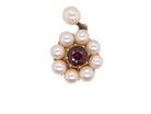 Pearl colour, cream pink, of a high quality with very little to no blistering. The clasp is 9 carat gold, hallmarks for Birmingham 1968. Set with a garnet and an outer cluster of cultured pearls. Diameter 12mm.