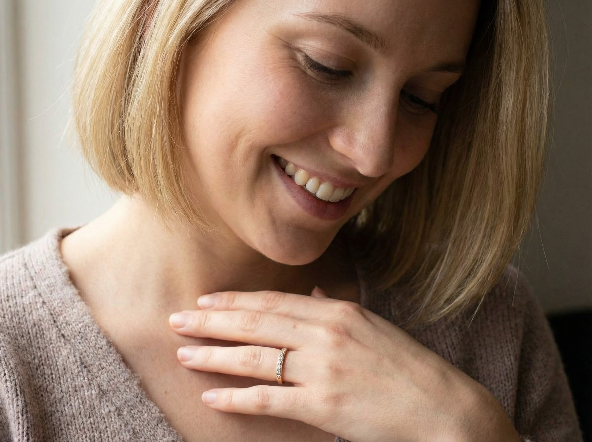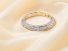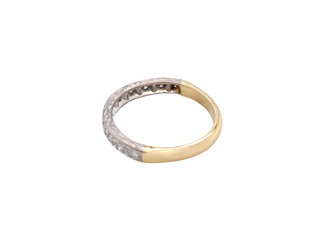 A traditional half hoop eternity ring. The front part of the ring is white gold and set with eleven small white diamonds, each 1.7mm (total estimated at 0.20 carats). Each edge of this part of the ring has scrolled hand engraving giving it that vintage look.