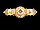 A pretty bar brooch containing a rub y centre stone 3mm diameter, with piqué work around the edge in the centre piece. Each end of the brooch has a small vertical line of four tiny seed pearls.